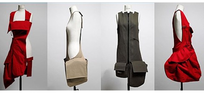 Un travail qui me rappelle un peu les vêtements-architectures de l’artiste-styliste Lucy Orta et notemment sa réalisation de 1992, d’habits-transformables selon la nécessité.