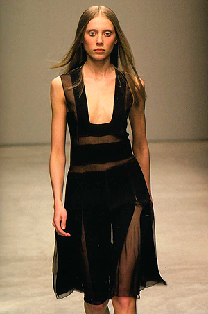 Robe noire transparente, encolure et bandes noires géométriques, rigoureuse et sensuelle (Prada, automne-hiver 2001-2002)