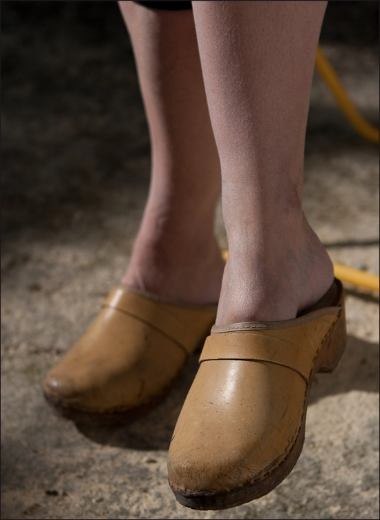 Cette année ce sont des sabots, trouvés au fond d’une armoire, qui nous font remonter 40 ans en arrière. Ils n’ont rien d’exceptionnel; bruts, taillés dans un parallélépipède de bois, rustiques (portables 10 mn sous peine de cou de pied meurtri!). On l’imagine aisément porté par des hippies ou par une fermière suédoise (celle avec nattes et longue robe fleurie).