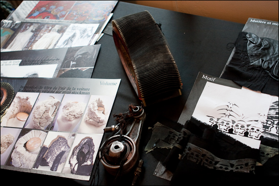 Les sources d’inspirations (filtre à air de voiture, bielle…), les cahiers de recherches et les effets de matières réalisés par la styliste Tsolmandakh Munkhuu