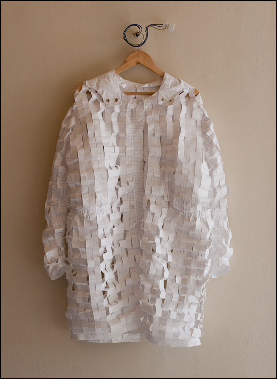 Autre collection sur le temps chez la danoise Nada Van Dalen. Elle retranscrit en vêtement une année difficile qu’elle à passé à Berlin. Un style très DIY, très punk et very angry. Ruban adhésif de bricolage (pour panser les blessures…) et coton se côtoient. Certains vêtements et accessoires sont « bariolés » par des traces de feutres. Collection et installation assez impactante mais somme toute assez anecdotique…