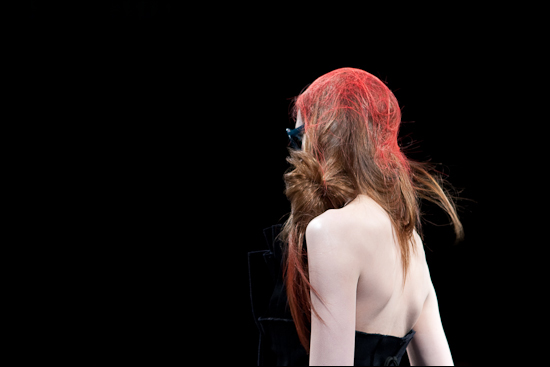 On retrouve en effet les volumes géométriques, les asymétries et le style chic-punk qui ont fait le succès de la maison au début des années 80. Noir, indigo et ivoire forment une palette de saison et seule une mèche de cheveux tantôt rouge tantôt bleu canard vient de temps en temps enflammer la silhouette.