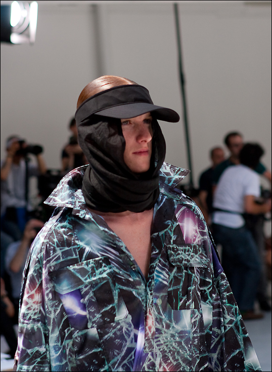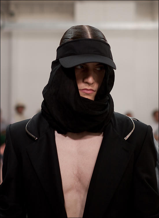Cette saison les zips chers au créateur, ont une fonction plus que décorative. Placé en bord de col, ils laissent apparaître une autre pièce de vêtement (capuche ou blouson anti-pluie, cf. première photo) qui vient se superposer au premier.