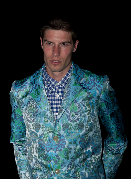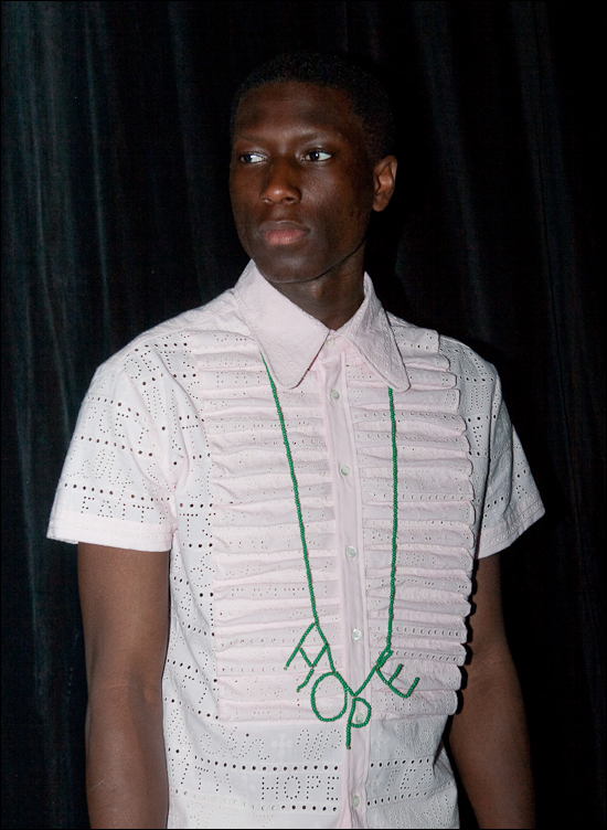 Mannequins bear-style ultra-musclés, contrasté avec un style à la naïveté assumée. Accessoires très ludiques (voir le sac à dos crocodile, sur la vidéo à 1:14) et toujours ces messages de paix et d’espoir, chers au créateur, brodés dans un style jour de Venise sur les vêtements ou les accessoires. Les carreaux côtoient d’autres carreaux, les unis fréquentent les imprimés façon chintz pour un ensemble assez bigarré.