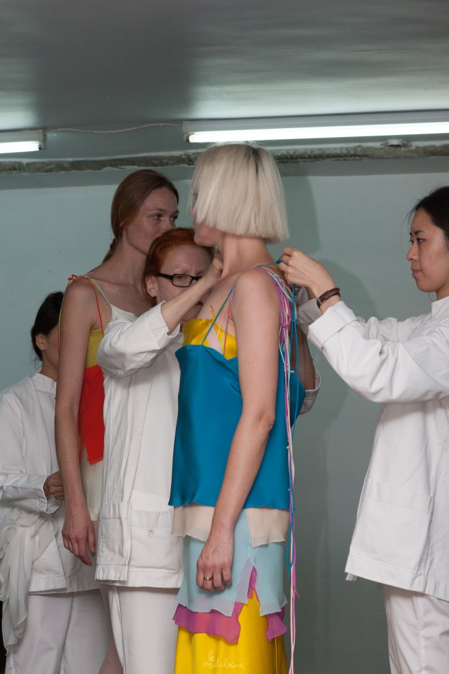 DURANT TOUT LE DÉFILÉ L’ARTISTE RÉVÈLE UNE PRATIQUE INCESSANTE, OBSESSIONNELLE, DESSINANT UN RÉSEAU DE NŒUDS ET DE SUPERPOSITIONS DIAPHANES ET COLORÉES.