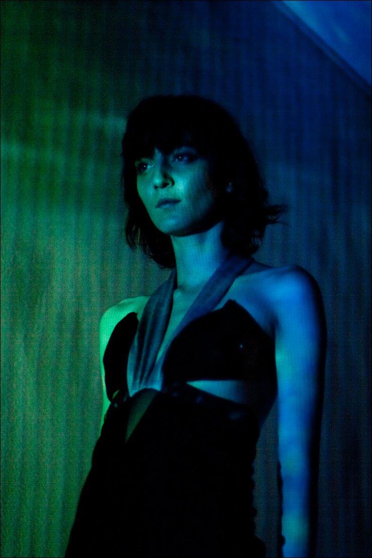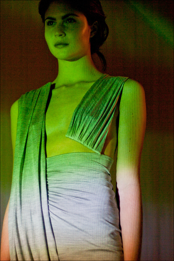 Les vêtements dessinent des formes géométriques, de légères parties métalliques maintiennent le jersey créant des angles. Sur une robe, un drapé léger s’arrête net sous le sein, une veste asymétrique a un pan basculé en angle droit sur le nombril.