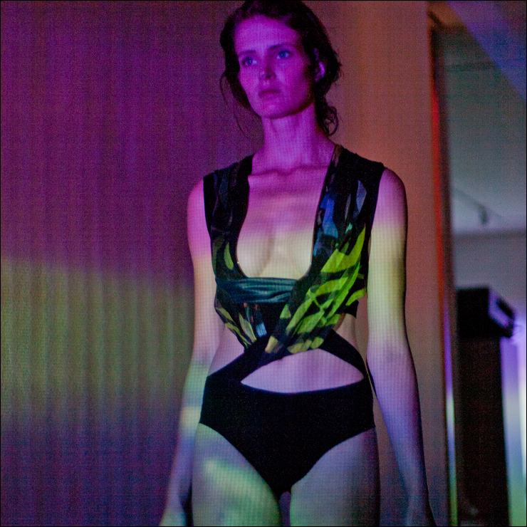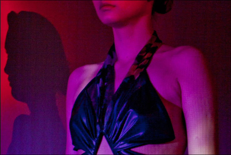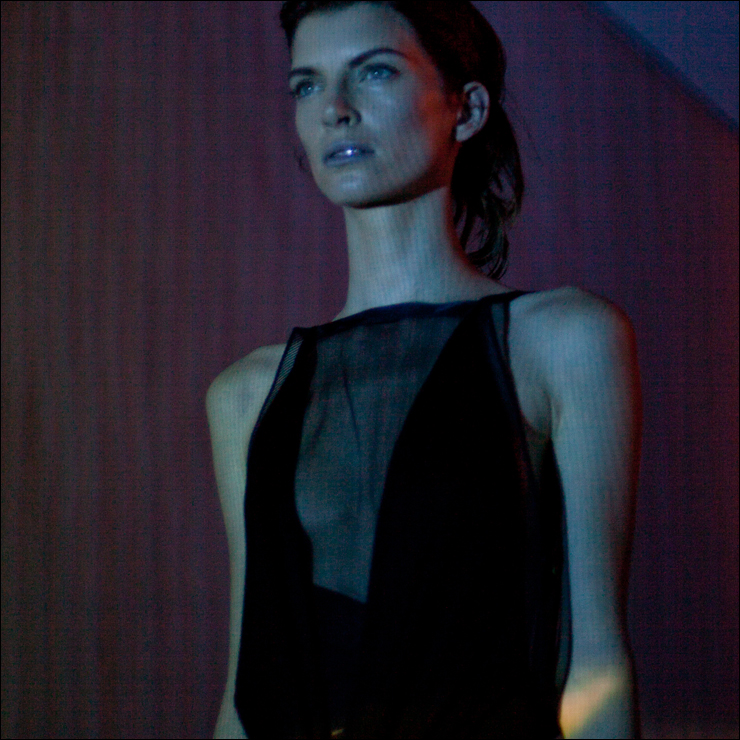Avec des moyens modestes on peut faire passer des histoires. Le jeu de lumière coloré, vient également habiller ces modèles riches en découpes et rompt avec la rigoureuse monochromie chère au créateur. Cette mise en scène met en exergue le dessin que forment les vêtements sur le corps et laisse place à un certain onirisme.