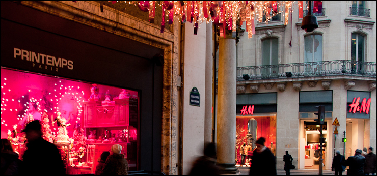 Séparé d’une petite dizaine de mètres, deux mégastores se font face, chacun sur une rive, Le Printemps dont les vitrines de Noël ont récemment été mise en scène par Alber Elbaz (voir la vidéo plus bas) et H&M fort d’une très médiatisée collaboration avec l’illustre maison Lanvin.