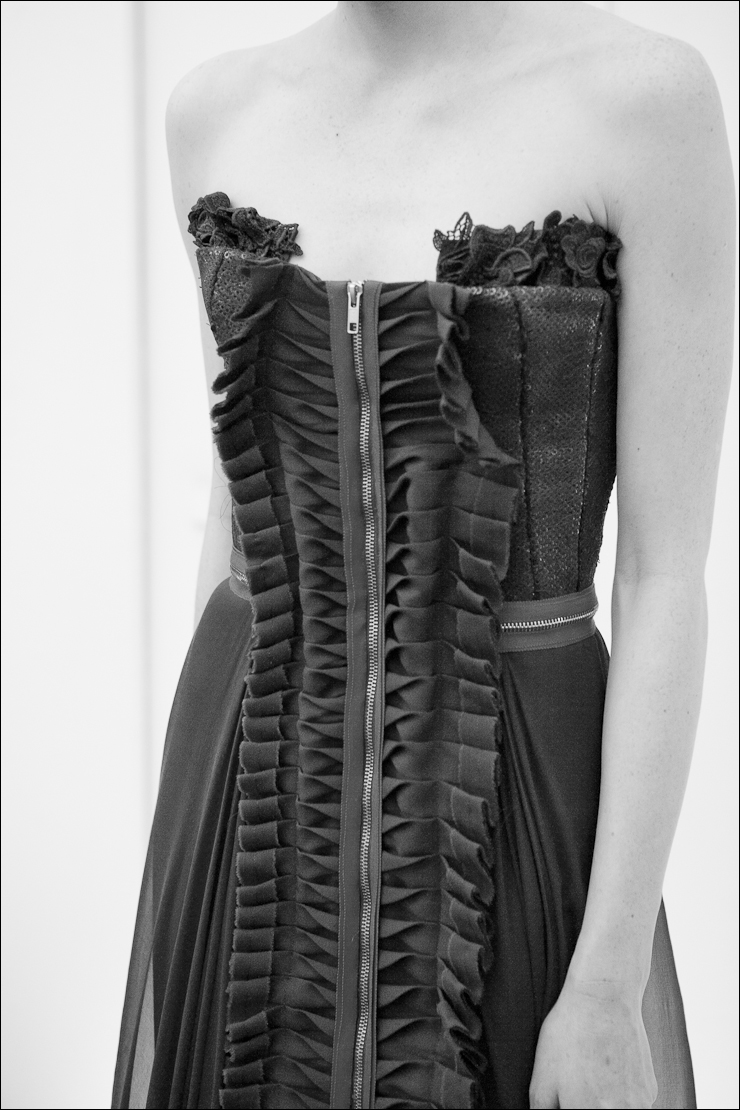 Robe bustier: comme précédemment, rencontre de matières et complication faite d’un pan devant entièrement rufflé. Le créateur modernise sa silhouette avec une grosse fermeture sur le milieu devant et qui souligne la taille.