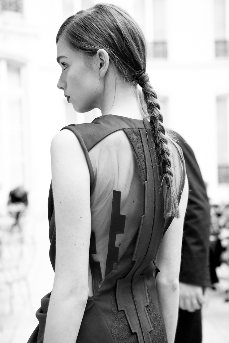 Ci-dessus, détails de dos, deux mondes se rencontrent,des éléments géométriques cohabitant avec des empiècements brodés, des découpes rectilignes sur la souplesse du voile.