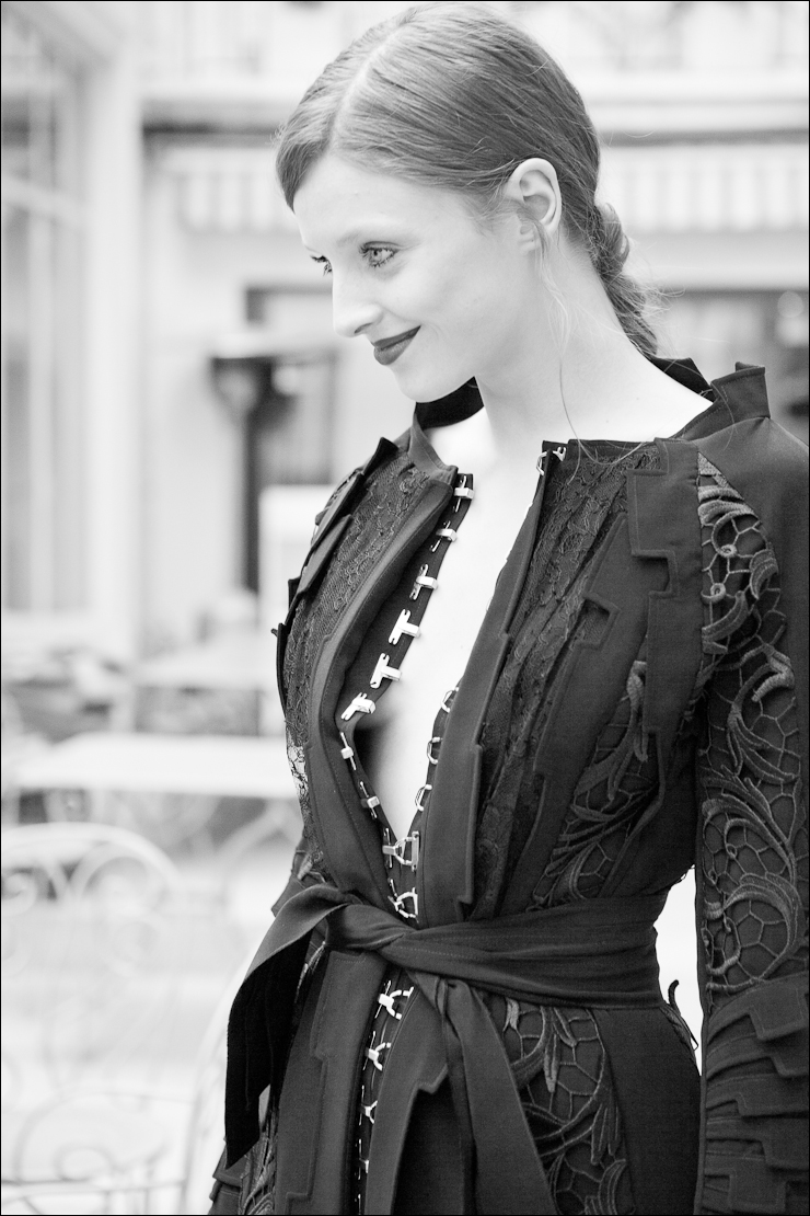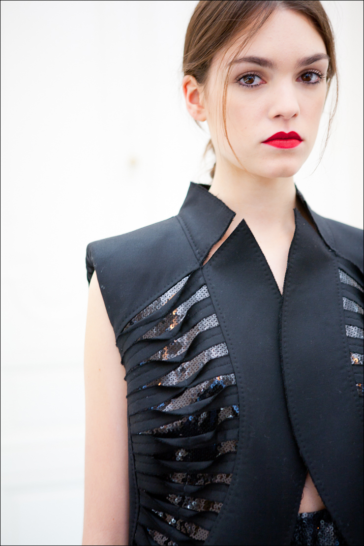 Idem ci-dessus, deux types de dentelles brodées et des empiècements géométriques façon « créneaux de chateau-fort » confèrent à l’ensemble un style néo-baroque. Les grosses agrafes métalliques « posées », permettent une fermeture bord à bord du vêtement et contrastent avec la tenue lui apportant ainsi une certaine modernité.