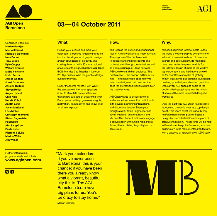 La deuxième édition de la Conférence annuelle de l’Alliance Graphique Internationale pour les étudiants et les professionnels aura lieu à Barcelone les 3 et 4 octobre. Une fois encore, cet évènement promet d’être un des points culminants de l’année du design graphique international.