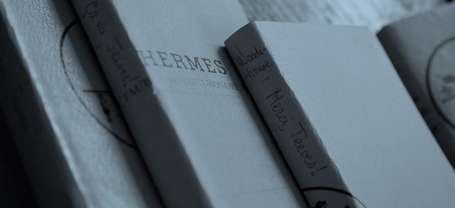 Vus dans la bibliothèque, des couvertures de livres de poche issus de sacs Hermès…