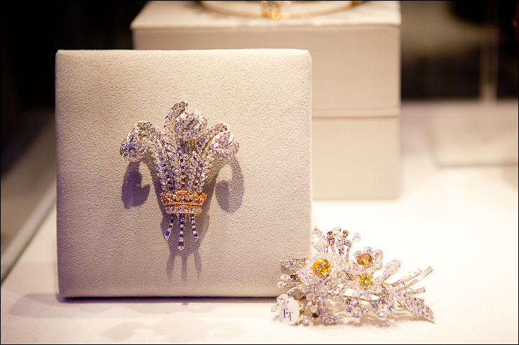 The prince of Wales brooch (diamond brooch), circa 1935, from the collection of Duchess of Windsor with a colored diamond, diamond flower and platinum brooch (gift from Eddie Fisher for Elizabeth’s taylor’s 30th birthday), 1959, Bulgari.