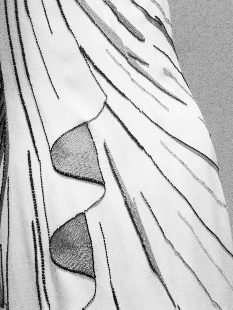 Détail d’une robe Chloé par Karl Lagerfeld, satin, broderies de tubes, 1984