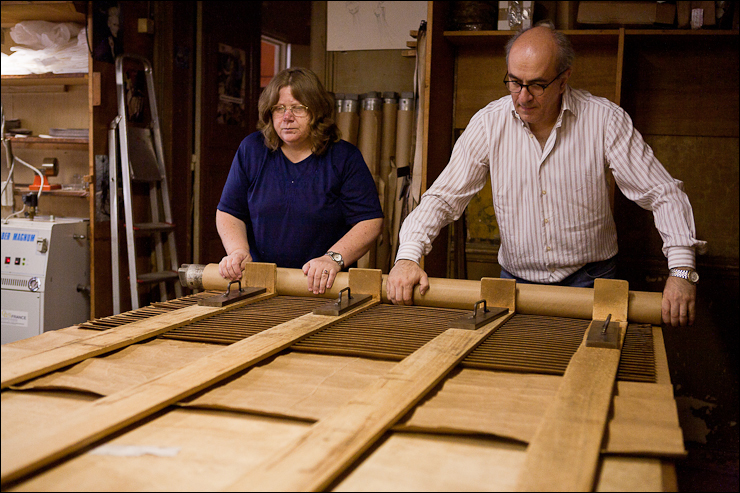 Ci-dessus, Marie-Laurence, 31 ans de maison et Karen en train d’installer un « métier » (un carton plissé)