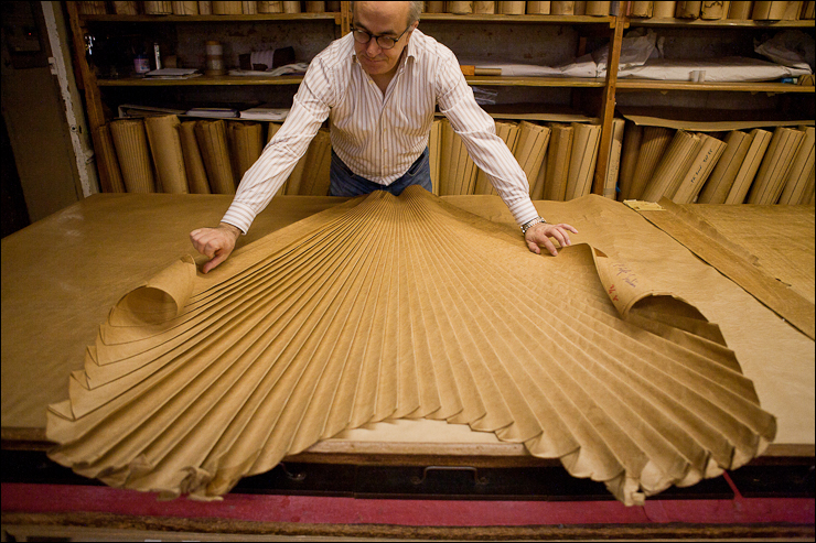 Plumassiers, brodeurs, fabricant de fleurs artificielles sont des métiers discrets de la mode et du luxe. Gérard Lognon, à la tête de l’atelier éponyme appartient à la quatrième génération de plisseurs, son arrière grand-mère ayant débuté l’activité sous Napoléon III.