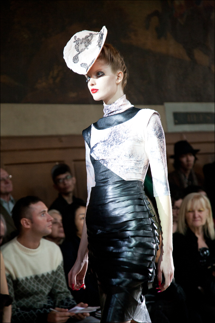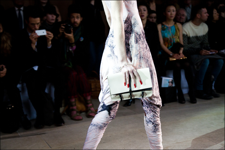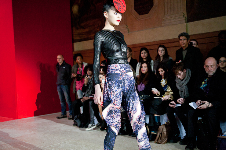 Graphiquement ces imprimés nous rappellent le travail de Juun J et ses imprimés bris de miroir du printemps-été 2011, que l’on a aussi vus chez Jean-Paul Gaultier, voir chez Julien Fournié pour la référence à l’anatomie. Mais c’est surtout la belge Cathy Pill et sa collection printemps-été 2006 qui me reviennent en mémoire.