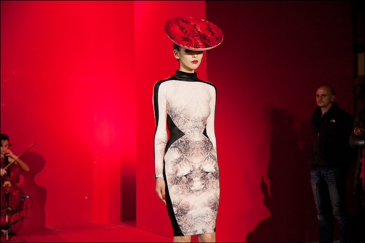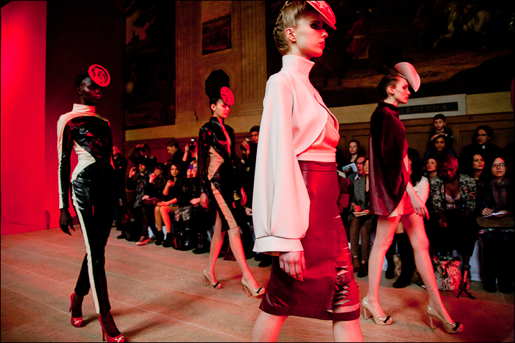 Les mannequins s’élancent d’un renfoncement rouge immaculé qui n’est pas sans évoquer la Chine, l’Orient…