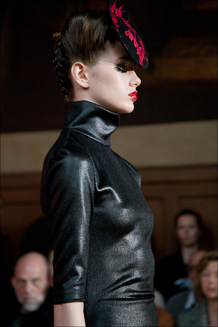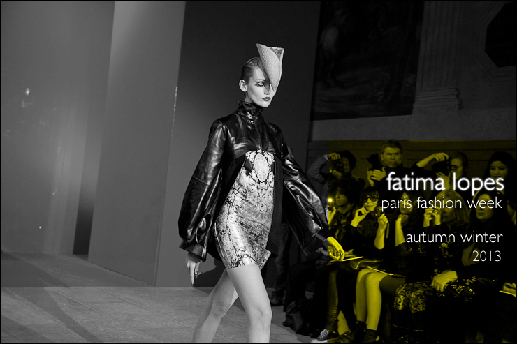 Fatima Lopes cède cette saison à la tendance morpho-body-conscious véhiculée par certains jeunes créateurs; cependant point de 3D ici. Cela se traduit par des empiècements rappelant les os et des imprimés « veineux », des découpes qui viennent souligner la taille et les hanches, des tons chairs et sanguins.