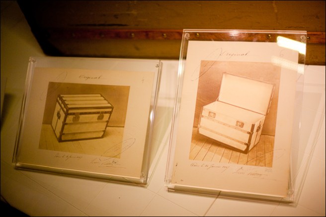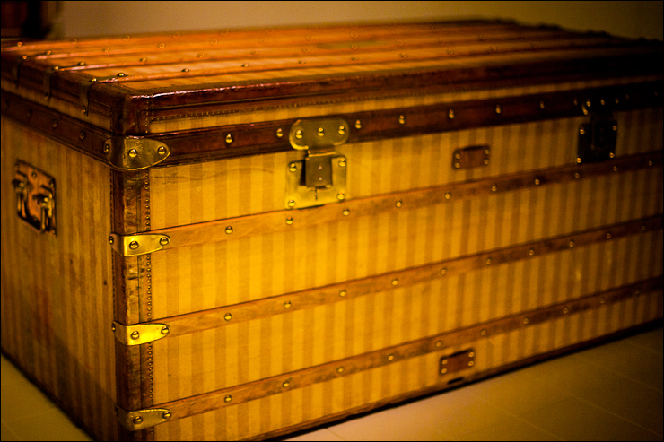 En 1877, Louis Vuitton dépose le brevet d’une toile rayée – Ci-dessus malle pour homme, toile rayée finition cuivrée (1882)
