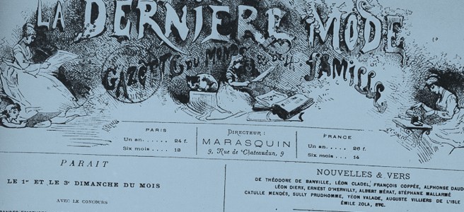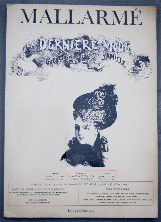 Mallarmé est le créateur de la revue La dernière mode, gazette du monde et de la famille (disponible en réédition française et datant de 1978 aux editions Ramsay)., il en est aussi l’auteur unique ! Toutes les chroniqueuses, grandes faiseuses de l’autorité que sont Marguerite de Ponty, Olympe la négresse, Miss Satin ou Zizy sont les divers pseudonymes féminins dont il s’empara pour rédiger sa revue. Seul le directeur de publication sera un personnage masculin nommé Marasquin.
