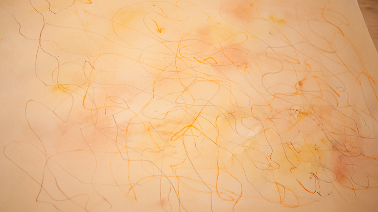 During 30 minutes, Maria Clark, the model, strikes poses on the contemporary music of Pierre Boulez: Notations I, II, IV and VII using her body as a medium, while the artist Desy Safan-Gerard is translating the gestures and the music on canvas. The process is completely improvised.
