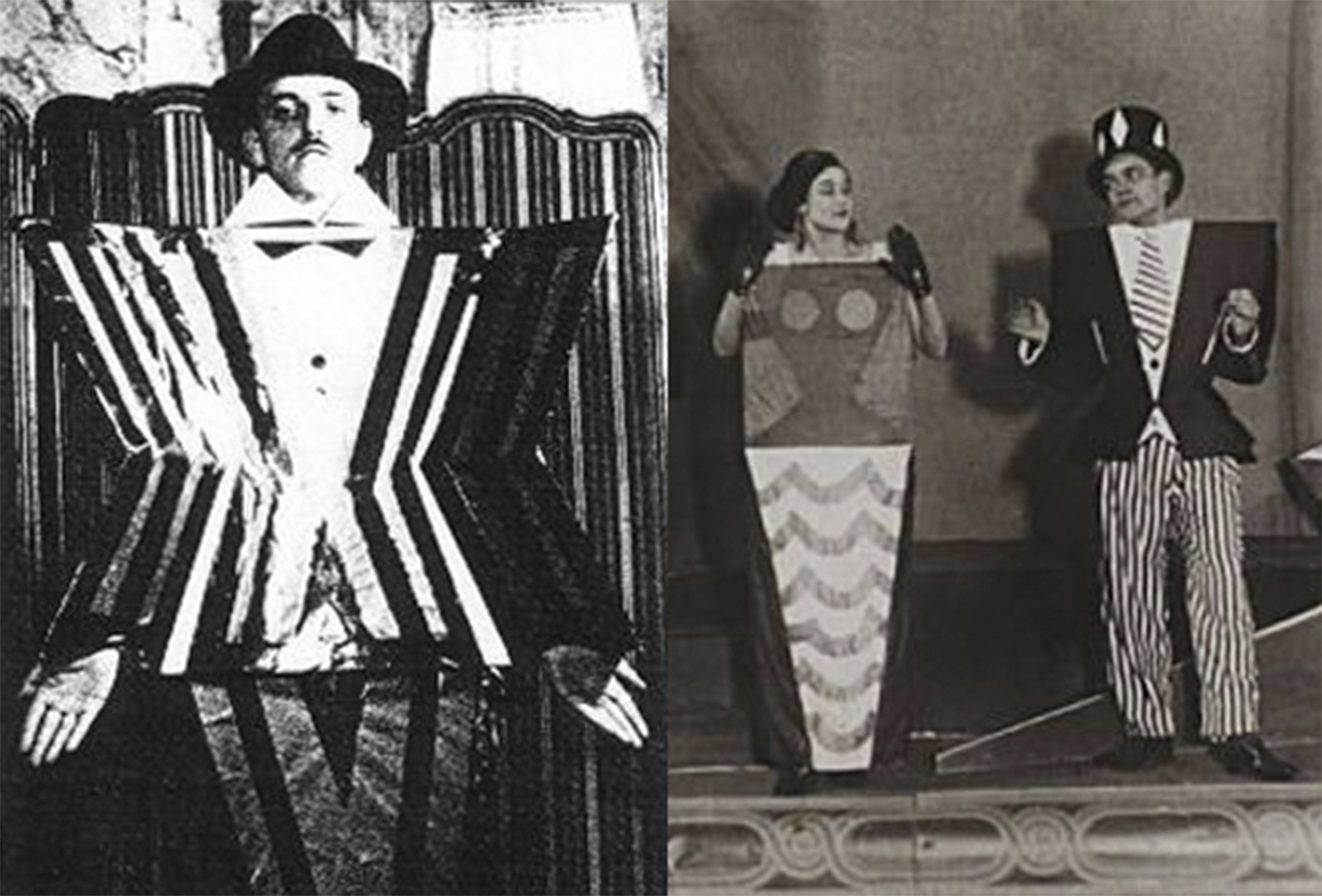 EN MARGE DE CETTE AGITATION, LES COSTUMES SONT RÉALISÉS PAR SONIA DELAUNAY. PARMI CEUX-CI UN COSTUME À EU UN PARCOURS PARTICULIÈREMENT ENRICHI. MONOCHROMATIQUE ET GÉOMÉTRIQUE IL A INSPIRÉ PLUSIEURS GÉNÉRATIONS D’ARTISTES ENGAGÉS…