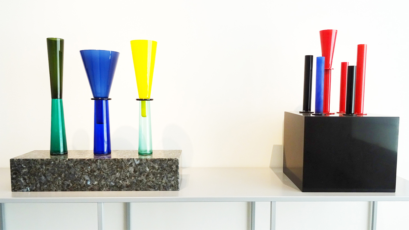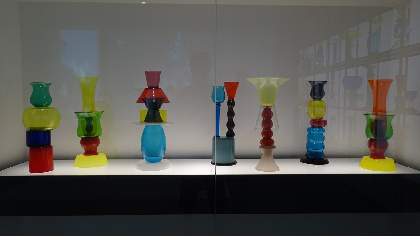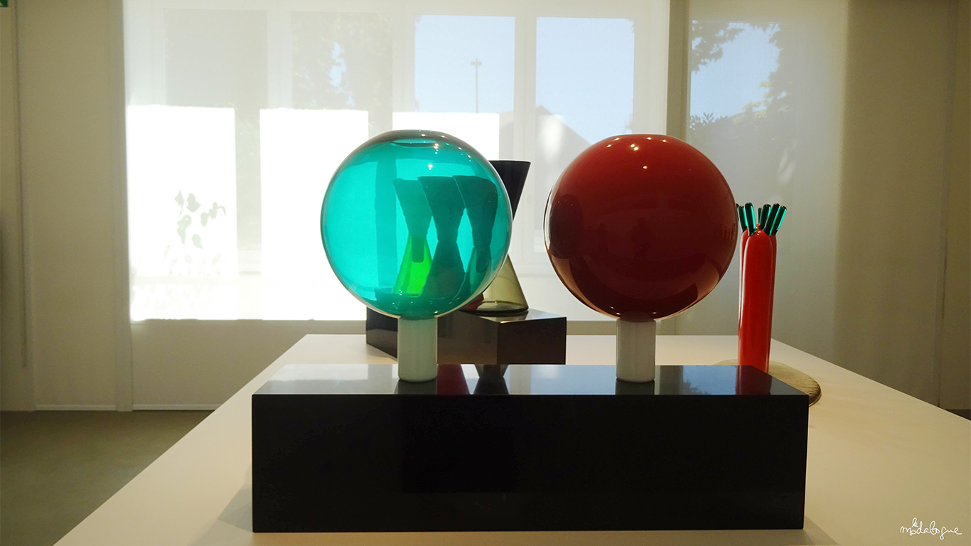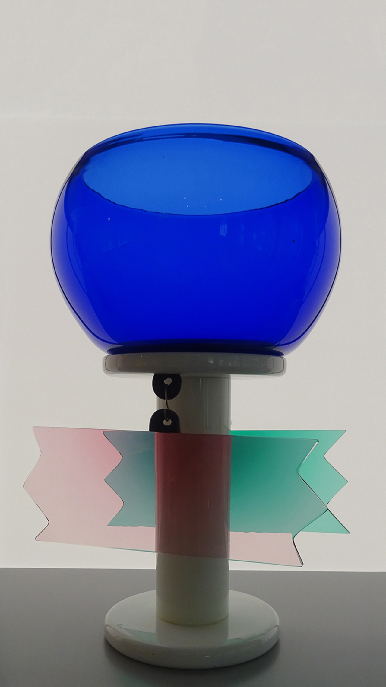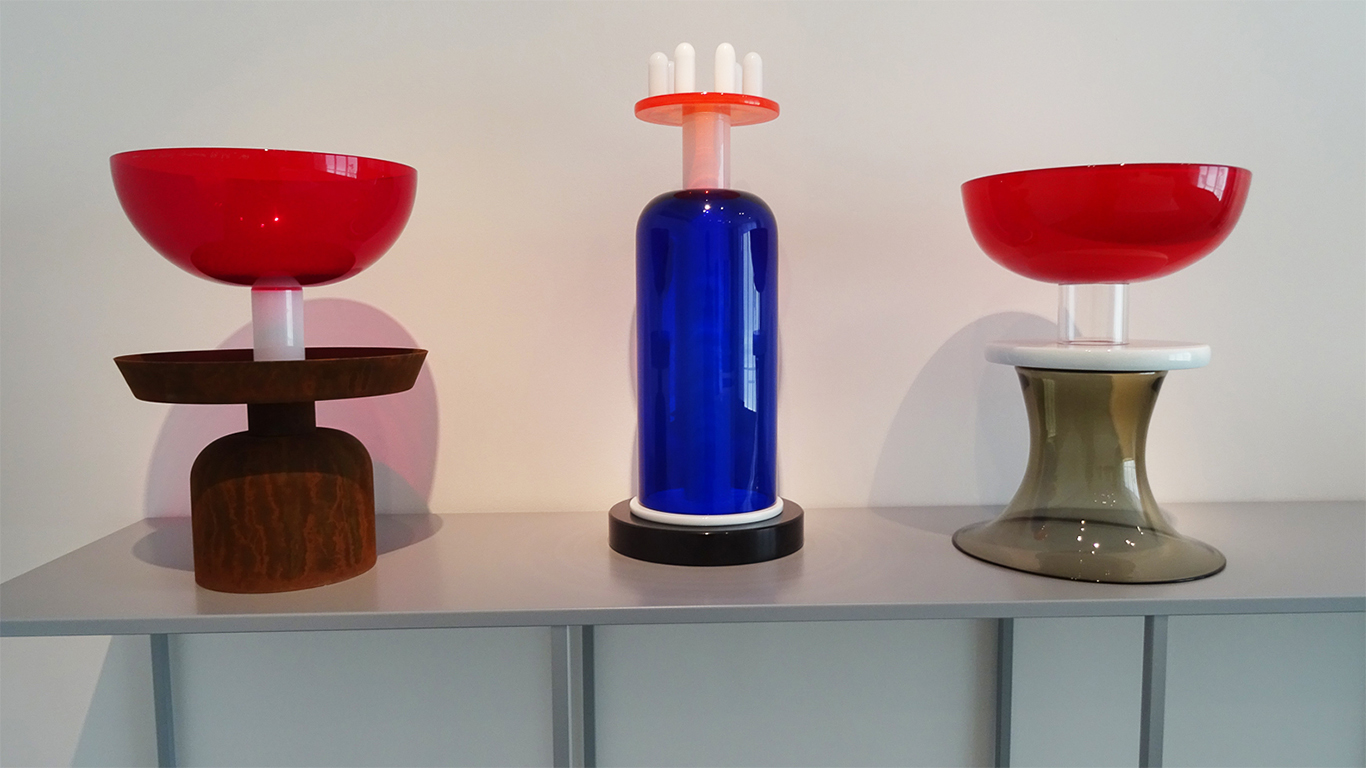 - 1986, POUR LA SECONDE COLLECTION MEMPHIS IL INTRODUIRA L’ASSEMBLAGE A LA COLLE CHIMIQUE BOUSCULANT LES TRADITIONS ANCESTRALES DE JOINTURE À CHAUD. CETTE COLLECTION ANTI-CONFORMISTE, MÊLE FORMES ET COULEURS QUI JOUENT AVEC LA TRANSPARENCE DU VERRE JUSQU’À RECRÉER DES MOTIFS ABSTRAITS QUI SERONT TRÈS EN VOGUE LORS DE LA PROCHAINE DÉCENNIE.