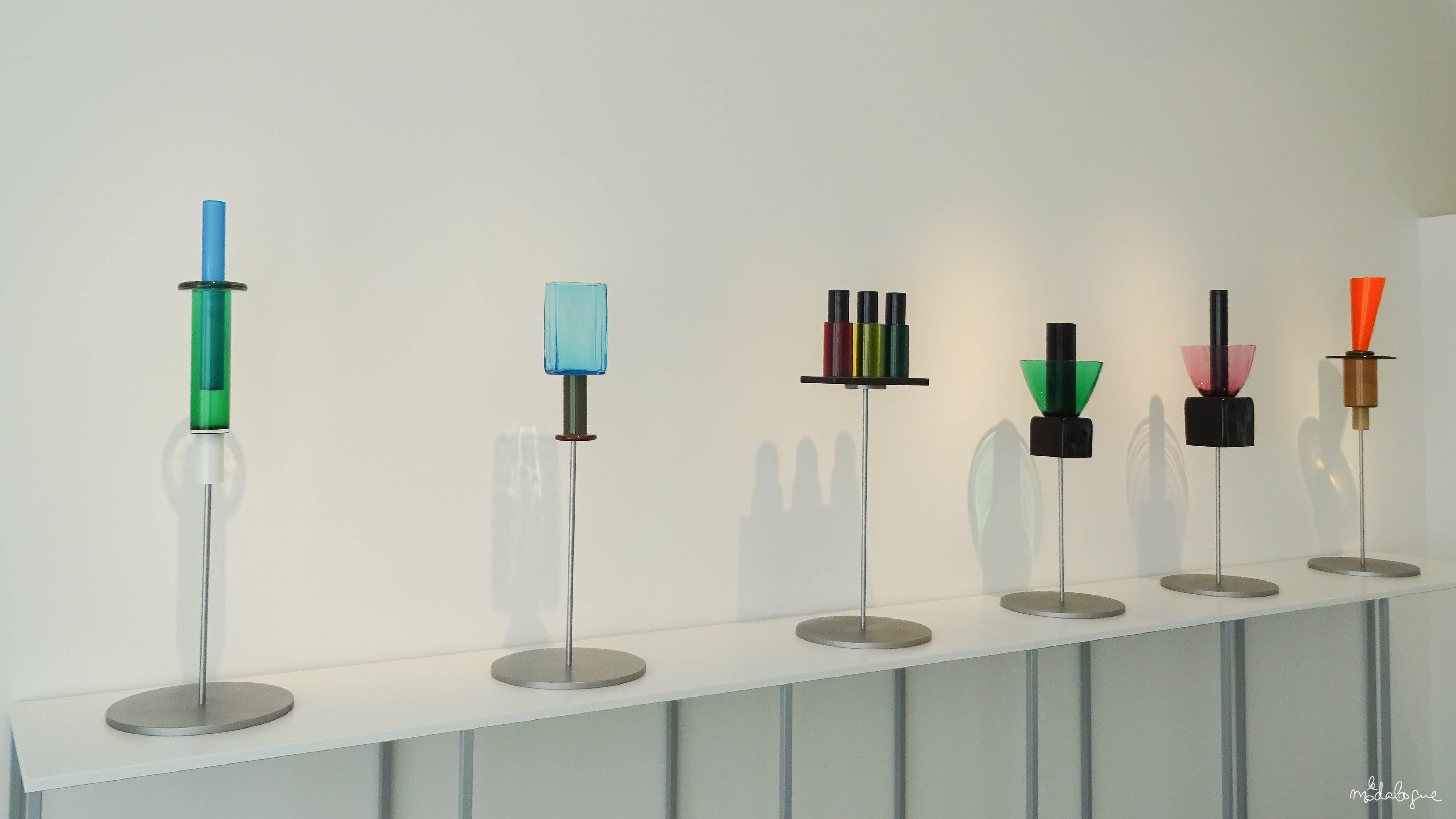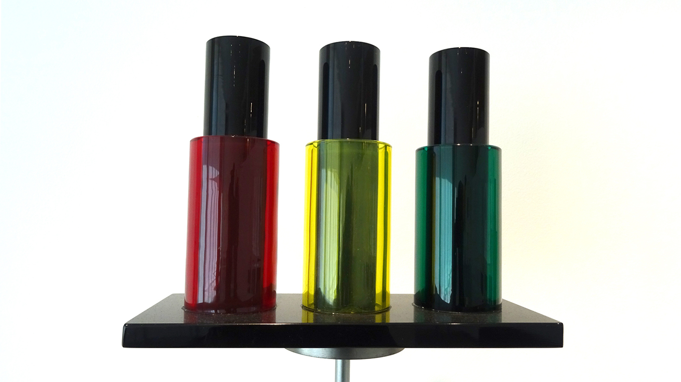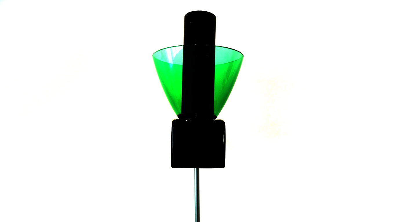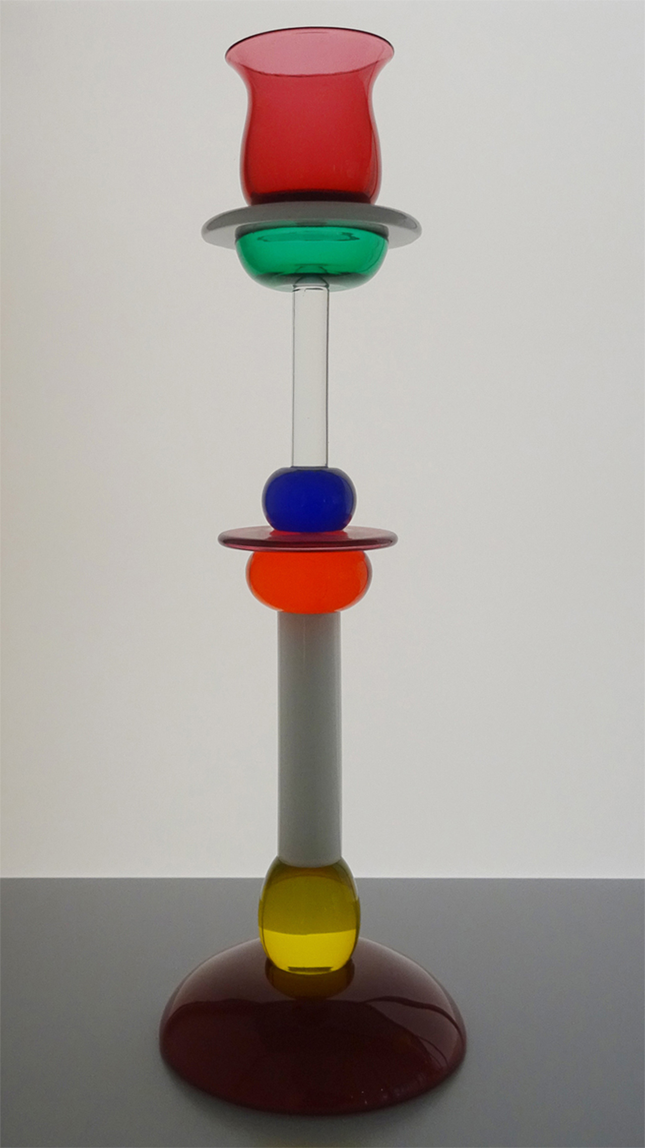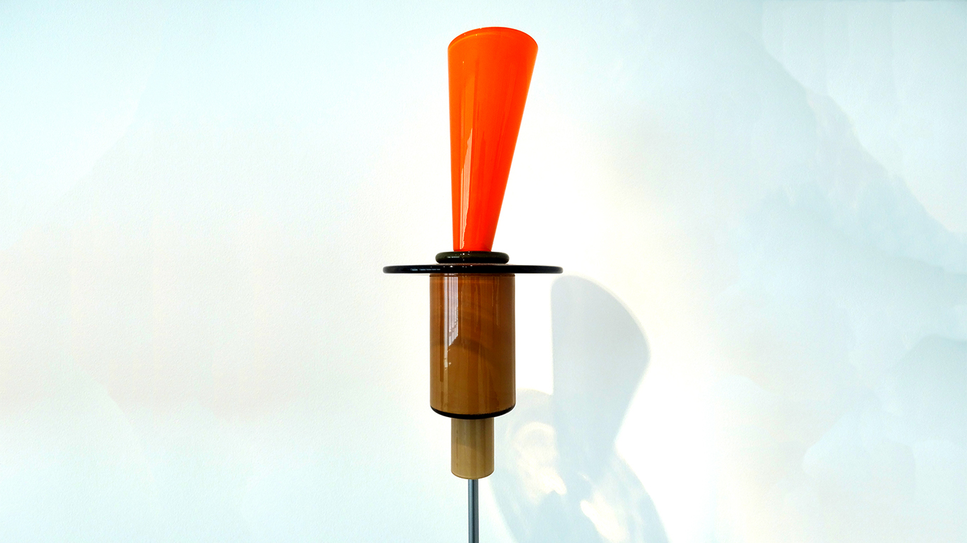 - 1986, POUR LA SECONDE COLLECTION MEMPHIS IL INTRODUIRA L’ASSEMBLAGE A LA COLLE CHIMIQUE BOUSCULANT LES TRADITIONS ANCESTRALES DE JOINTURE À CHAUD. CETTE COLLECTION ANTI-CONFORMISTE, MÊLE FORMES ET COULEURS QUI JOUENT AVEC LA TRANSPARENCE DU VERRE JUSQU’À RECRÉER DES MOTIFS ABSTRAITS QUI SERONT TRÈS EN VOGUE LORS DE LA PROCHAINE DÉCENNIE.