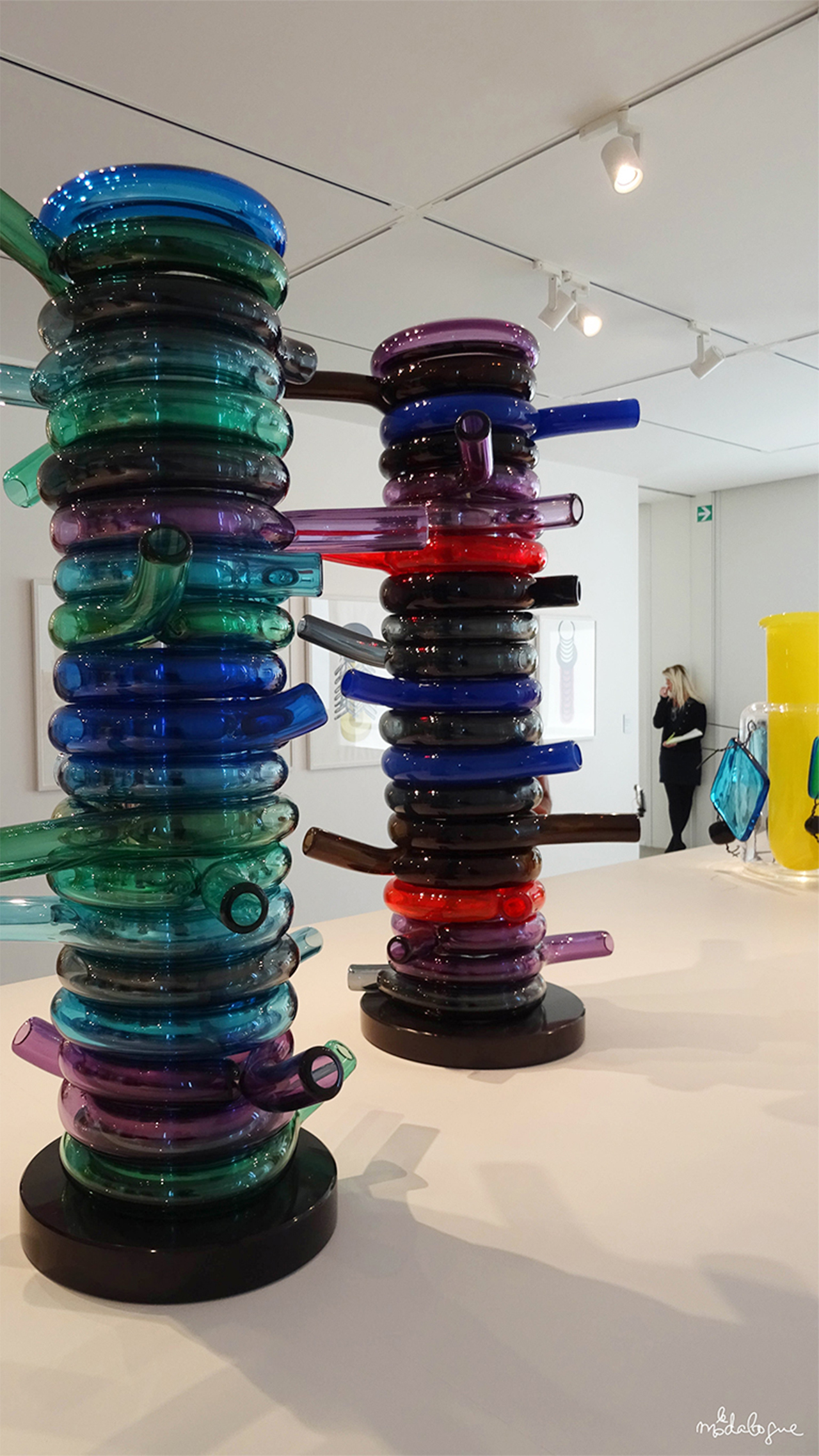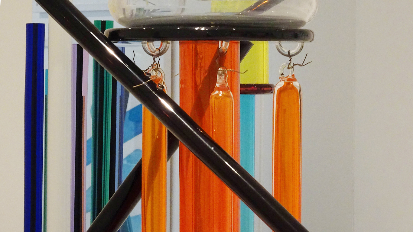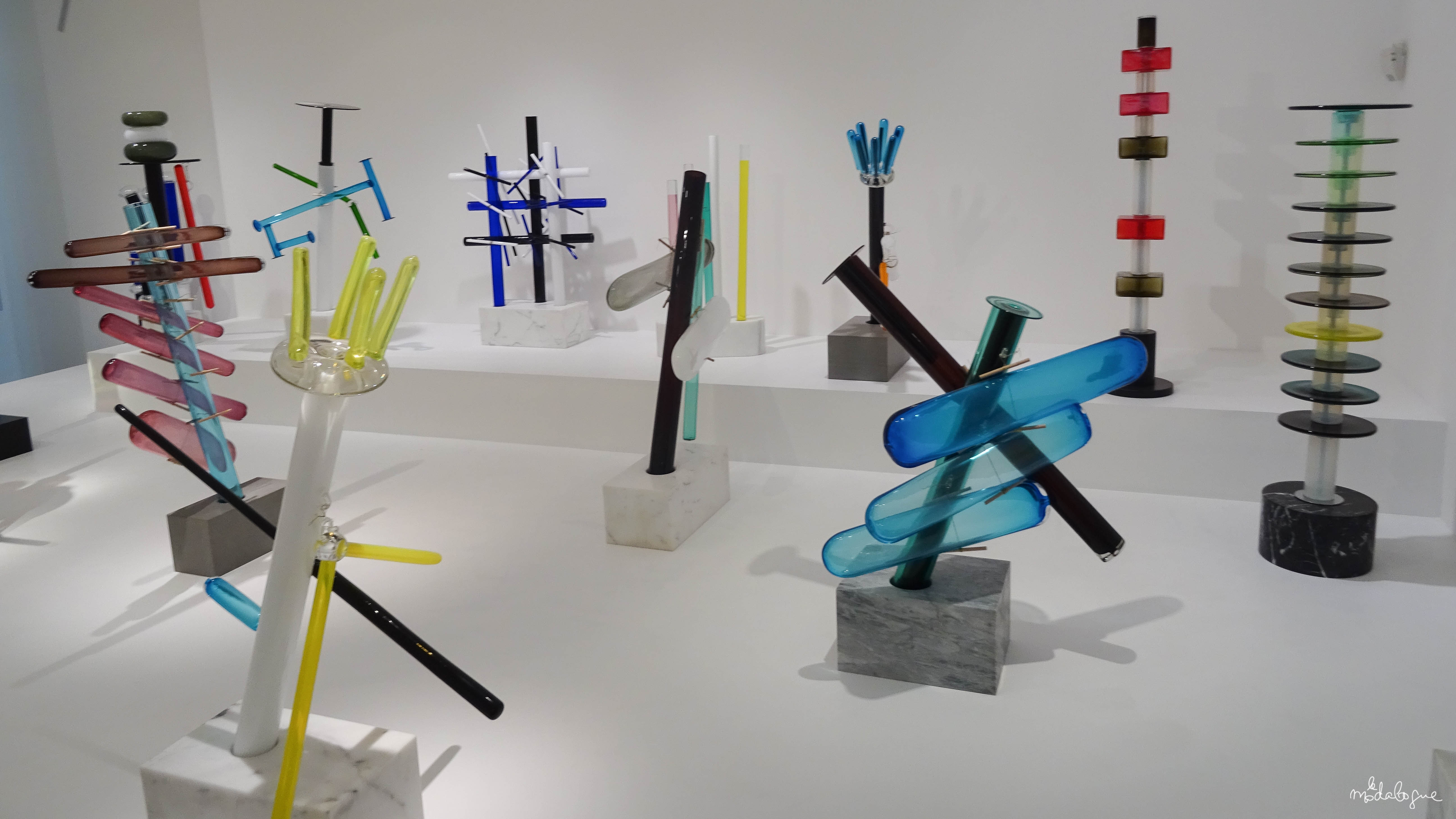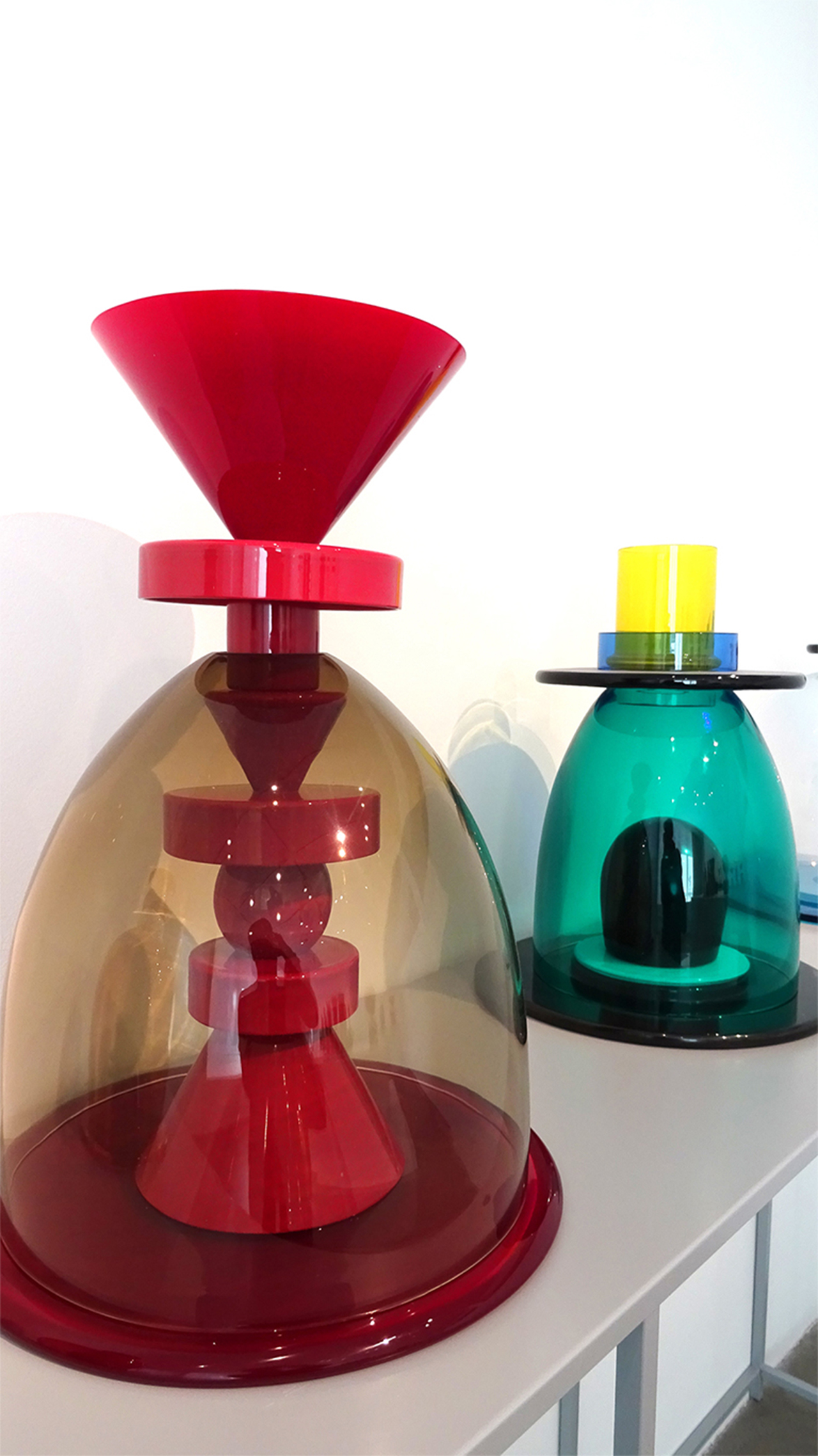 - 1986, POUR LA SECONDE COLLECTION MEMPHIS IL INTRODUIRA L’ASSEMBLAGE A LA COLLE CHIMIQUE BOUSCULANT LES TRADITIONS ANCESTRALES DE JOINTURE À CHAUD. CETTE COLLECTION ANTI-CONFORMISTE, MÊLE FORMES ET COULEURS QUI JOUENT AVEC LA TRANSPARENCE DU VERRE JUSQU’À RECRÉER DES MOTIFS ABSTRAITS QUI SERONT TRÈS EN VOGUE LORS DE LA PROCHAINE DÉCENNIE.