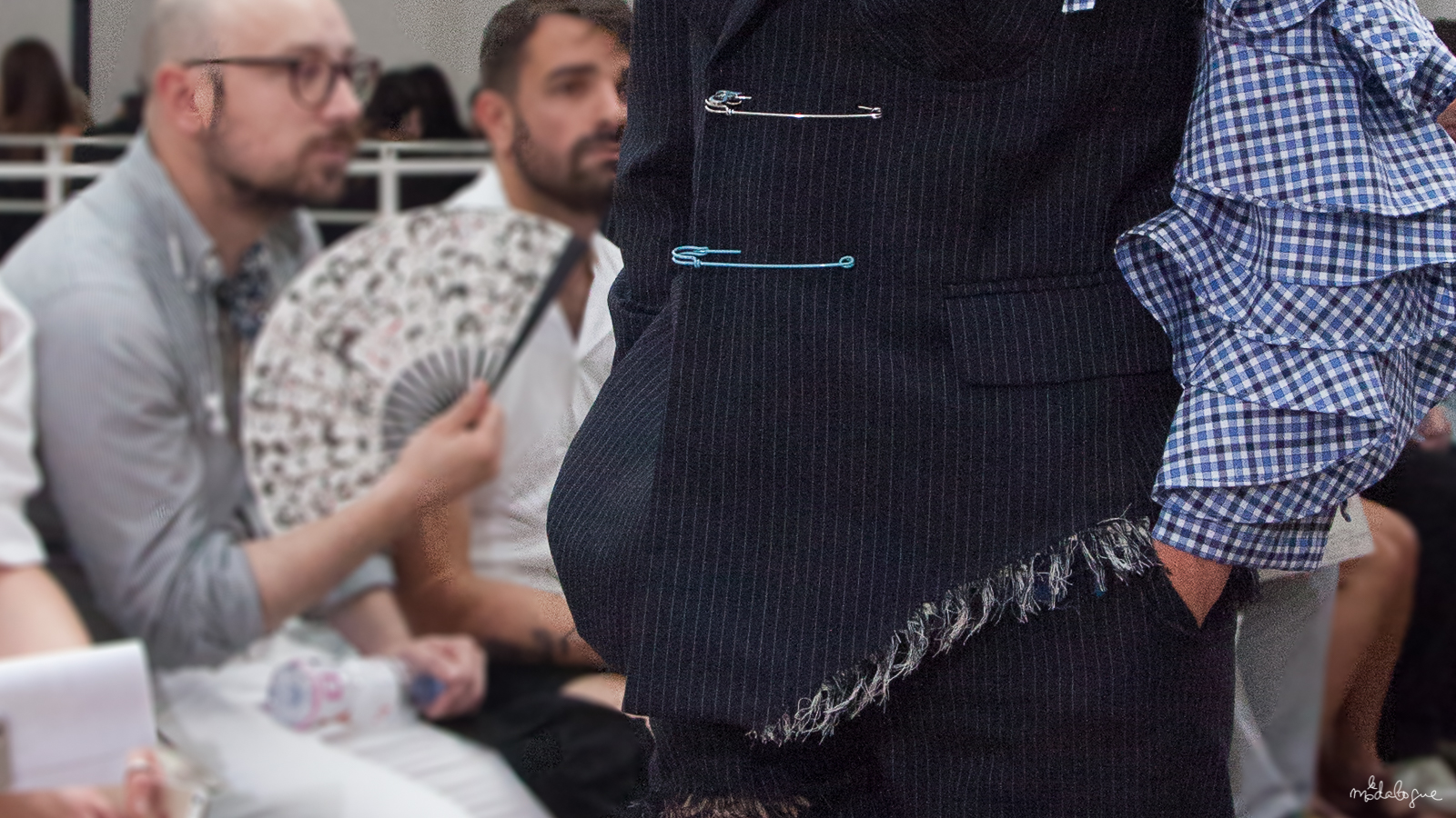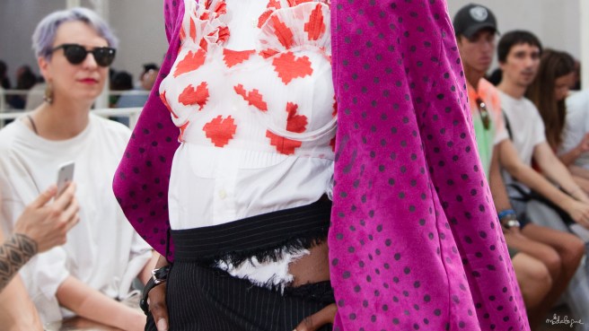 LES NOMBREUX DÉTAILS, VOLANTS, EFFILOCHAGES, PLISSÉS, COLLIER LONG (FAISANT IRRÉSISTIBLEMENT PENSER À MADEMOISELLE CHANEL), LES RÉFÉRENCES TAILORING (GILET, TRENCH…) CLASSENT FACETASM SI BESOIN ÉTAIT DANS UNE CATÉGORIE HYBRIDE. HIROMICHI OCHIAI EST EN RECHERCHE PERMANENTE D’UNE HARMONIE NON-CONVENTIONNELLE, DES SILHOUETTES PUISANT ET MIXANT DANS PLUSIEURS GARDE-ROBES. COMME S’IL Y AVAIT EU UNE CASCADE DE PARCOURS STYLISTIQUE, DU « GLITCH DANS MON ARMOIRE » AVEC UNE DOSE DE CHIC ET DE POP, UNE GLITCH COUTURE DE LUXE.