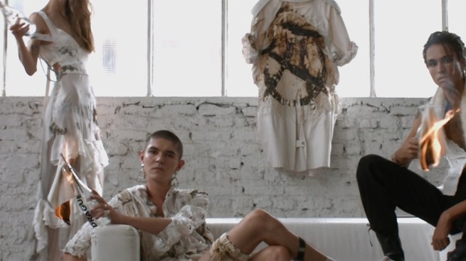 ASSISTÉE PAR DES AMIS, AU MOIS DE JUILLET, ROSIE BROWNING À CRÉER POUR LE COMPTE DE L’HOMME UN DÉFILÉ-FÊTE. LE VESTIAIRE EST FAIT À PARTIR DE VÊTEMENTS POUR FEMME 100% RECYCLÉS, CHAQUE PIÈCE, VINTAGE, CHINÉE, RÉCUPÉRÉE, ÉTAIT REPENSÉE ENTIÈREMENT, DE SA CONSTRUCTION À SA CUSTOMISATION, RECRÉANT AINSI DES PIÈCES UNIQUES DOTÉES D’UNE ÉNERGIE SINGULIÈRE ET D’UN DESIGN DISTINCT.