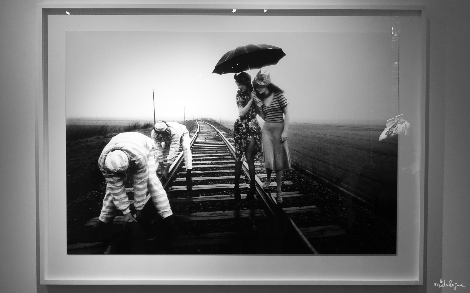 ELLES PLONGENT LEUR REGARD DANS CELUI DES HOMMES ET AGUICHENT EN JUPE FENDUE HAUT SUR LA CUISSE ET DÉCOLLETÉ PLONGEANT. ICI LA COMPOSITION, OUTRE LES MAINTES INTERPRÉTATIONS QU’ON PEUT LUI ACCORDER FAIT AUSSI PLACE À LA CRÉATION GRAPHIQUE: LES RAYURES DES PRISONNIERS RÉPONDENT AUX TRAVERSES DES RAILS QUI EUX-MÊMES S’ACCORDENT AUX RAYURES DU PULL.