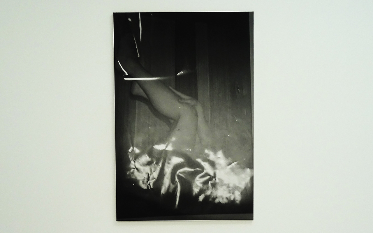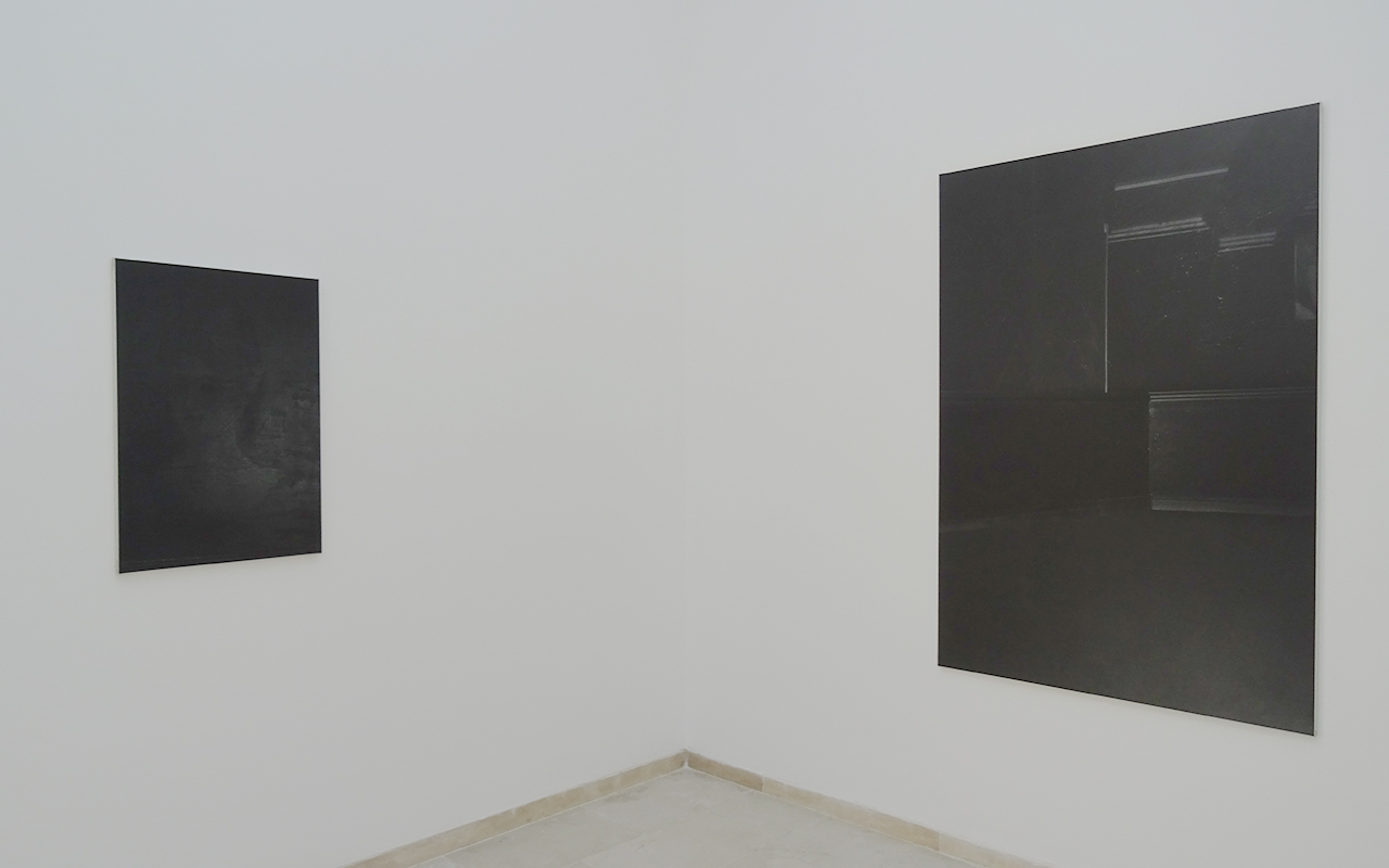 NOUS SOMMES FACE À UNE IMAGE RADICALEMENT NOIRE, JUSQU’À CE QUE L’ON SE RENDRE COMPTE QU’IL S’AGIT D’UNE ILLUSION SPECTRALE. ON PERÇOIT ALORS UNE PRÉSENCE QUI ÉMERGE DE LA PHOTOGRAPHIE MONUMENTALE. LA PLUPART DES PHOTOS ONT UNE DIMENSION DE 120 X 180 CM, GRAND FORMAT QUI CONTRIBUE AU CHOC VISUEL QUE L’ON REÇOIT PAR EXEMPLE SUR LE TRIPTYQUE, PREMIER ACCROCHAGE DÈS QUE L’ON PÉNÈTRE AU SEIN DU PAVILLON.