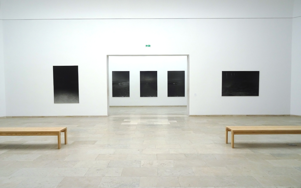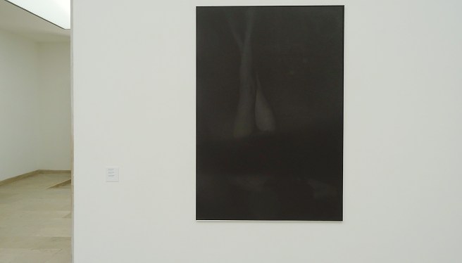 NOUS SOMMES FACE À UNE IMAGE RADICALEMENT NOIRE, JUSQU’À CE QUE L’ON SE RENDRE COMPTE QU’IL S’AGIT D’UNE ILLUSION SPECTRALE. ON PERÇOIT ALORS UNE PRÉSENCE QUI ÉMERGE DE LA PHOTOGRAPHIE MONUMENTALE. LA PLUPART DES PHOTOS ONT UNE DIMENSION DE 120 X 180 CM, GRAND FORMAT QUI CONTRIBUE AU CHOC VISUEL QUE L’ON REÇOIT PAR EXEMPLE SUR LE TRIPTYQUE, PREMIER ACCROCHAGE DÈS QUE L’ON PÉNÈTRE AU SEIN DU PAVILLON.