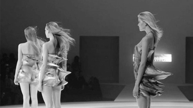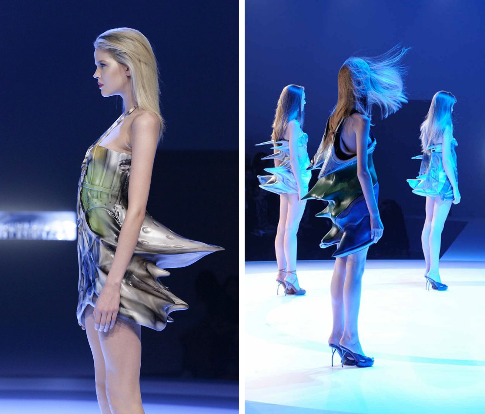 LA MÊME ANNÉE LE DESIGNER DE MODE HUSSEIN CHALAYAN TRAÇAIT LUI AUSSI LES CONTOURS DE SES ROBES COMME FIGÉES EN MOUVEMENT, EN ACCÉLÉRATION, FIGÉES À UN INSTANT i D’UN CRASH.