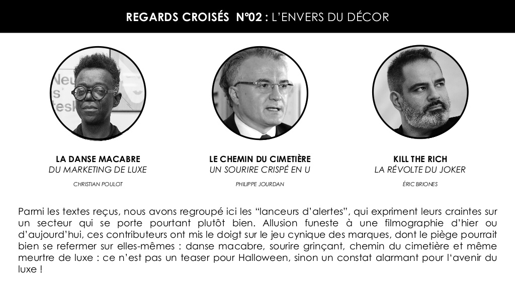 ON ACHÈVE BIEN LE LUXE DANS UNE DANSE MACABRE OÙ L’ON CONFOND ET OÙ IL EST DIFFICILE POUR LA NOUVELLE GÉNÉRATION D’IDENTIFIER LA FRONTIÈRE ENTRE LE LUXE DE LA PUBLICITÉ ET LE LUXE EN TANT QUE PRATIQUE SOCIALE.