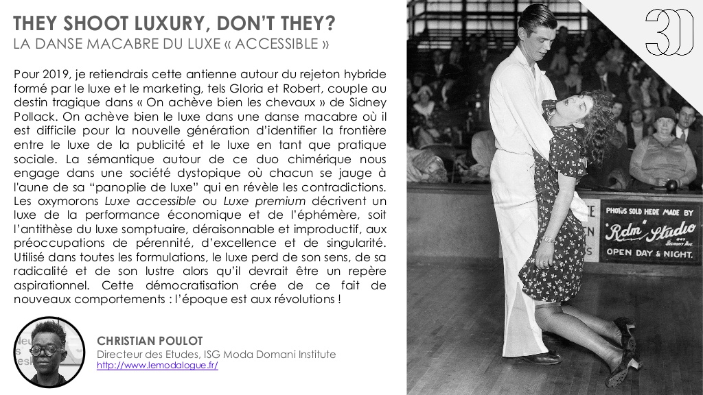 EN CETTE ANNÉE JE RETIENDRAIS CETTE ANTIENNE AUTOUR DU REJETON HYBRIDE FORMÉ PAR LE LUXE ET LE MARKETING, TELS GLORIA ET ROBERT, COUPLE AU DESTIN TRAGIQUE D’“ON ACHÈVE BIEN LES CHEVAUX” DE SIDNEY POLLACK.