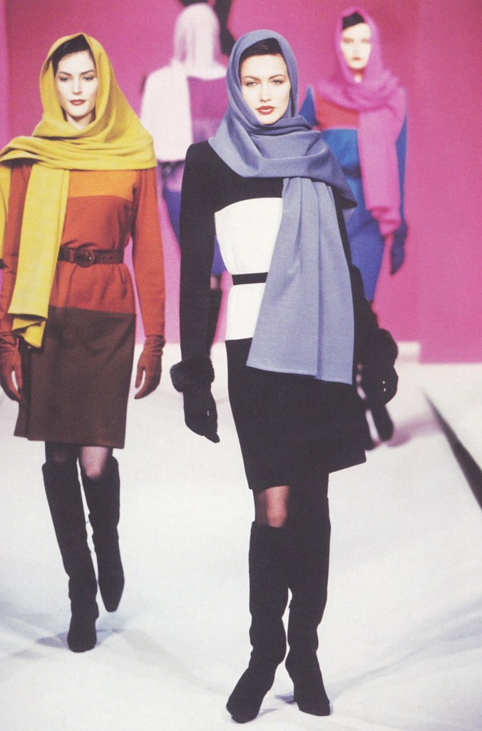 Sur les photos ci-dessous issuent de la collection automne hiver 1997 de Yves Saint Laurent Rive Gauche une longue écharpe entouré le visage des mannequins, il s’agit d’une déclaration stylistique et artistique (la collection étant un hommage à Mondrian). Les temps ayant changé, beaucoup d’idées se sont déplacées sur le plan politique, religieux, social et culturel. Une telle représentation pourrait-elle être aujourd’hui sans provoquer de polémique ?