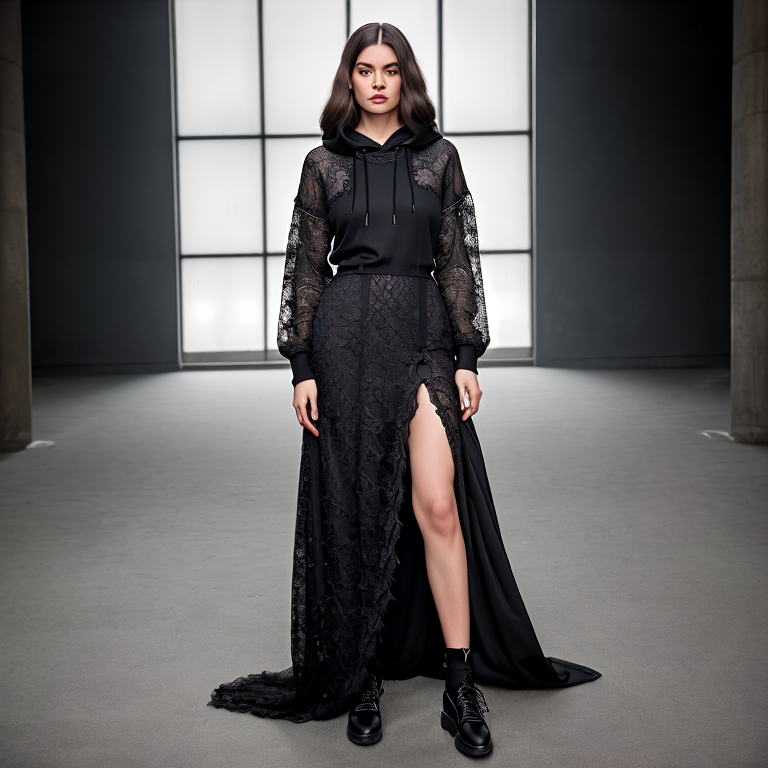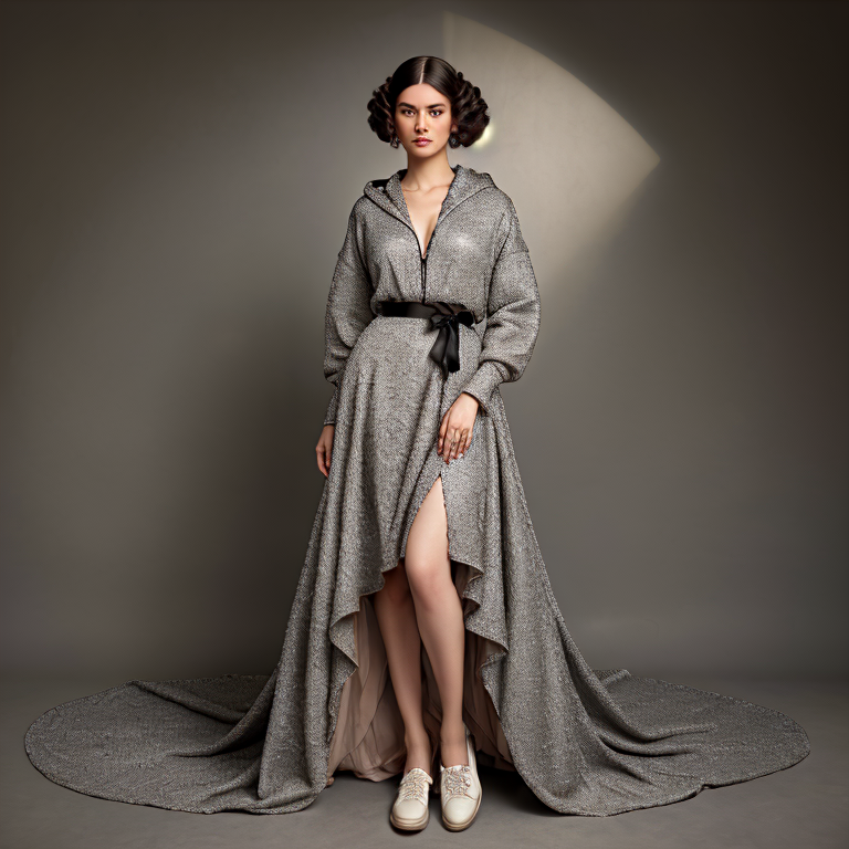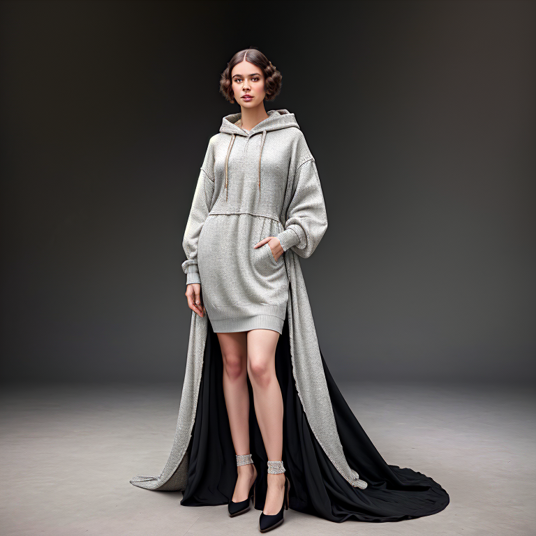 Ci-dessous, d’autres axes de recherche sur des choix de matières différentes (polaire, soie…), une orientation hoodie « de luxe » à traîne, des contrastes de longueurs. Tout cela réclame un réglage très fin des prompts de base où chaque terme doit être pondéré selon le résultat escompté. On peut, en effet, s’éloigner entièrement (et inversement) de la référence selon la valeur des termes. Plus que du prompt engineering, il s’agit d’un réel travail de styliste exigeant des connaissances.