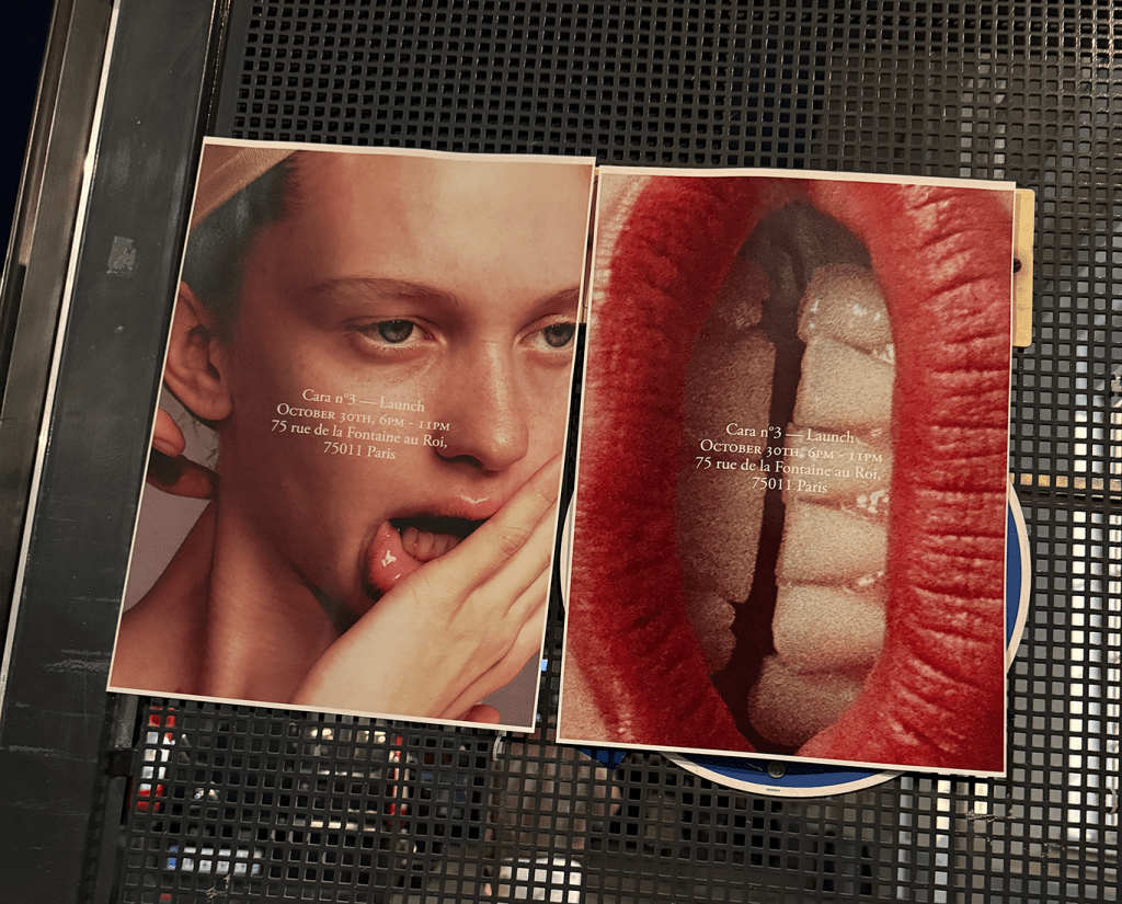 L’ensemble du dispositif fait écho à une installation qui évoque une mise en scène proche d’un évènement d’art contemporain. Cara est au centre d’un écosystème plus vaste que l’objet imprimé lui-même: une expérience, un rituel de lancement, un lieu, une sociabilité.