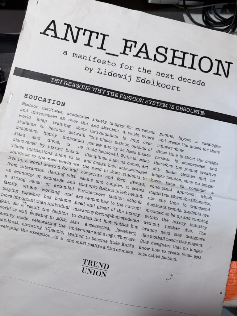 J’ai ré-ouvert le manifeste Anti-Fashion où en 2015 Li Edelkoort, la célèbre prévisionniste hollandaise décrétait la « mort de la mode », pointant du doigt un système éducatif formant des « divas » déconnectées de la réalité industrielle.