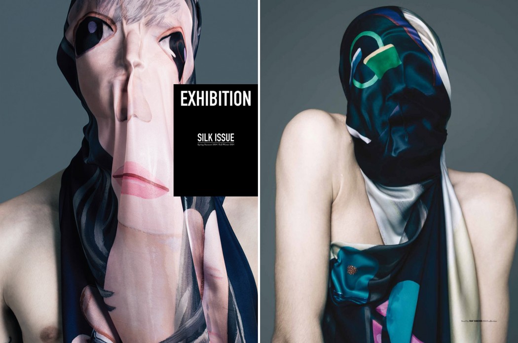 On retrouve L’idée, dans la série de photos de Daniele + Iango (duo de photographes ayant principalement travaillé pour Vogue, I-D, Muse…) du dernier magazine EXIBITHION, « silk issue », notamment en couverture. Les foulards imprimés sont portés en cagoules, façon Maison Martin Margiela (ici) et laissent le choix de deux lectures: instinctive ou réfléchie (prise de recul) au moment où l’oeil arrête de « voir » et « regarde ».