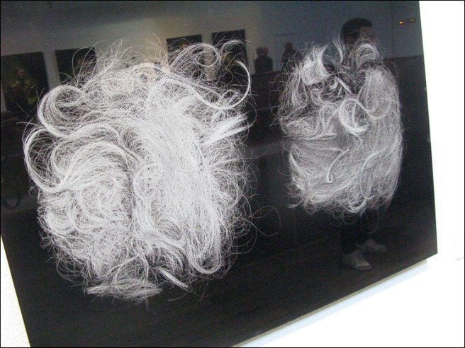 Ci-dessus, Christophe Martinez, Set de table en cheveu, 2009 qui n’est paa sans rappeler Méret Oppenheim et son déjeuner en fourrure de 1936