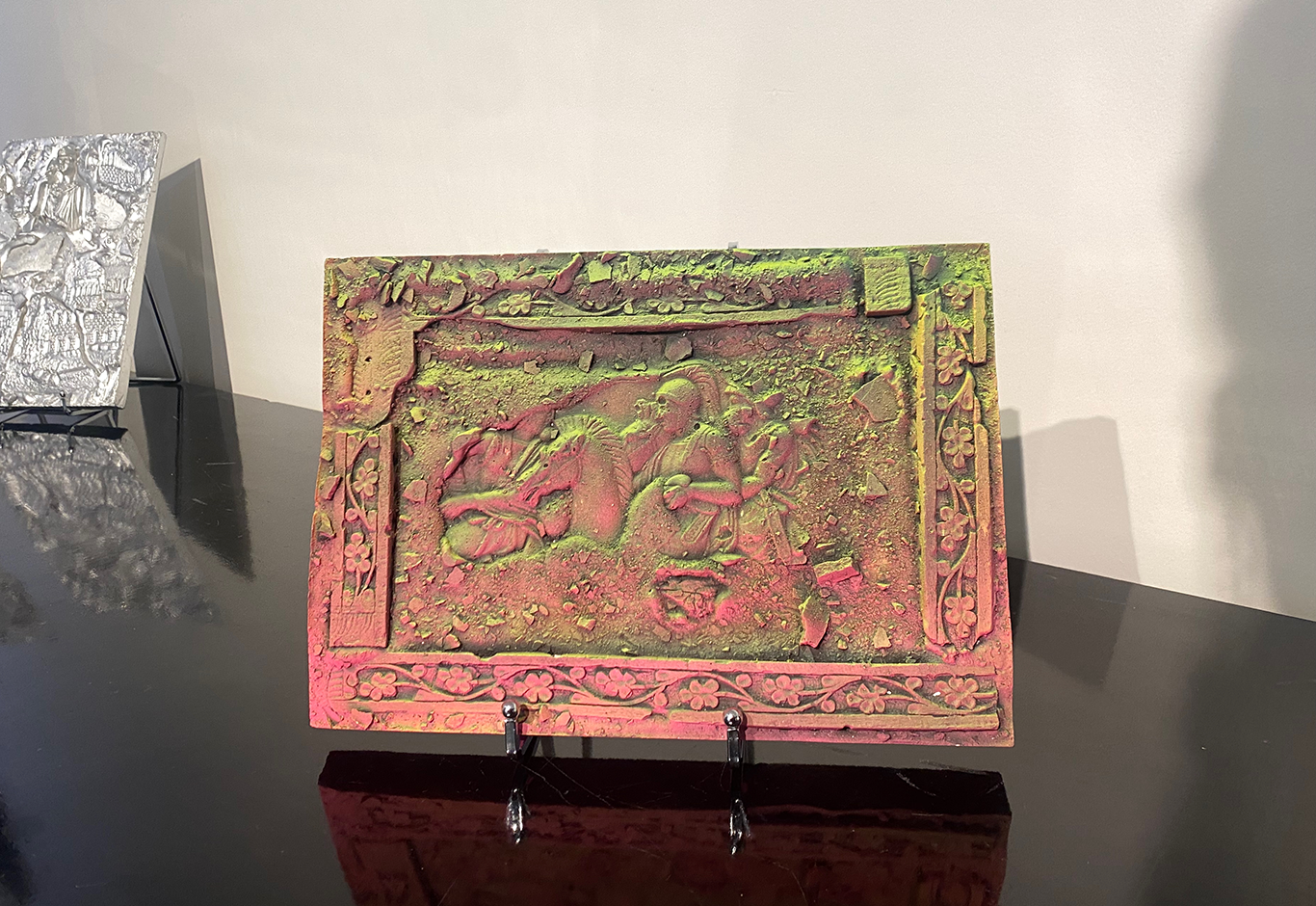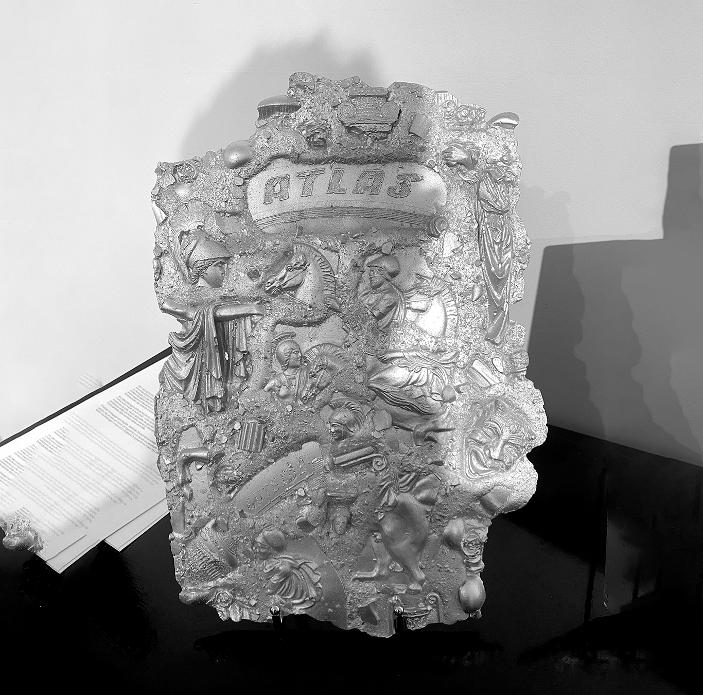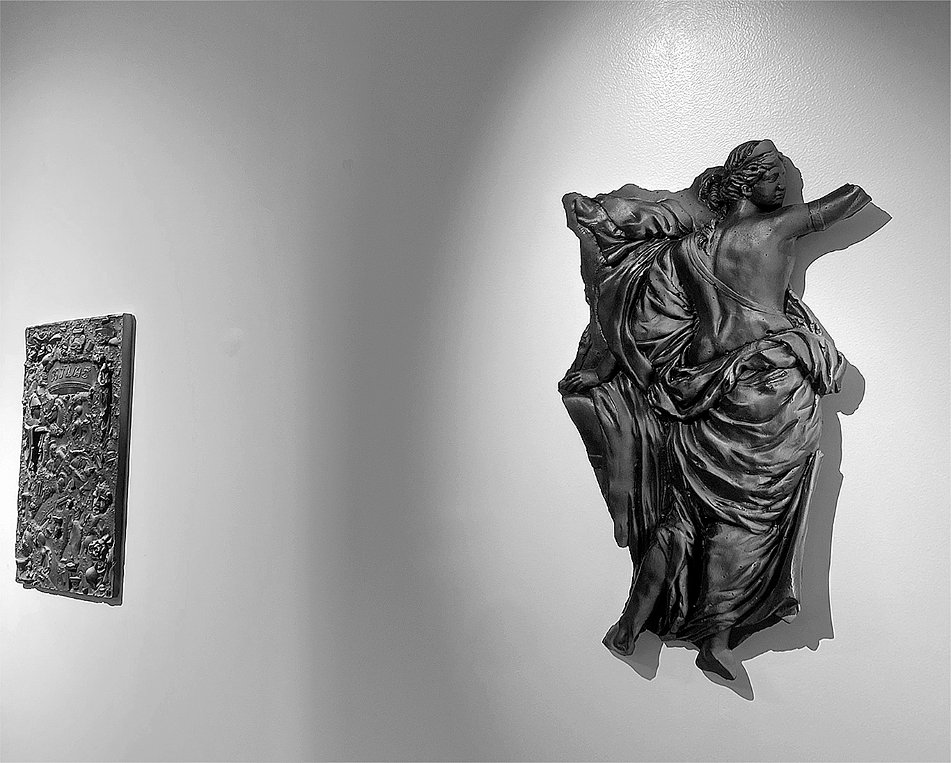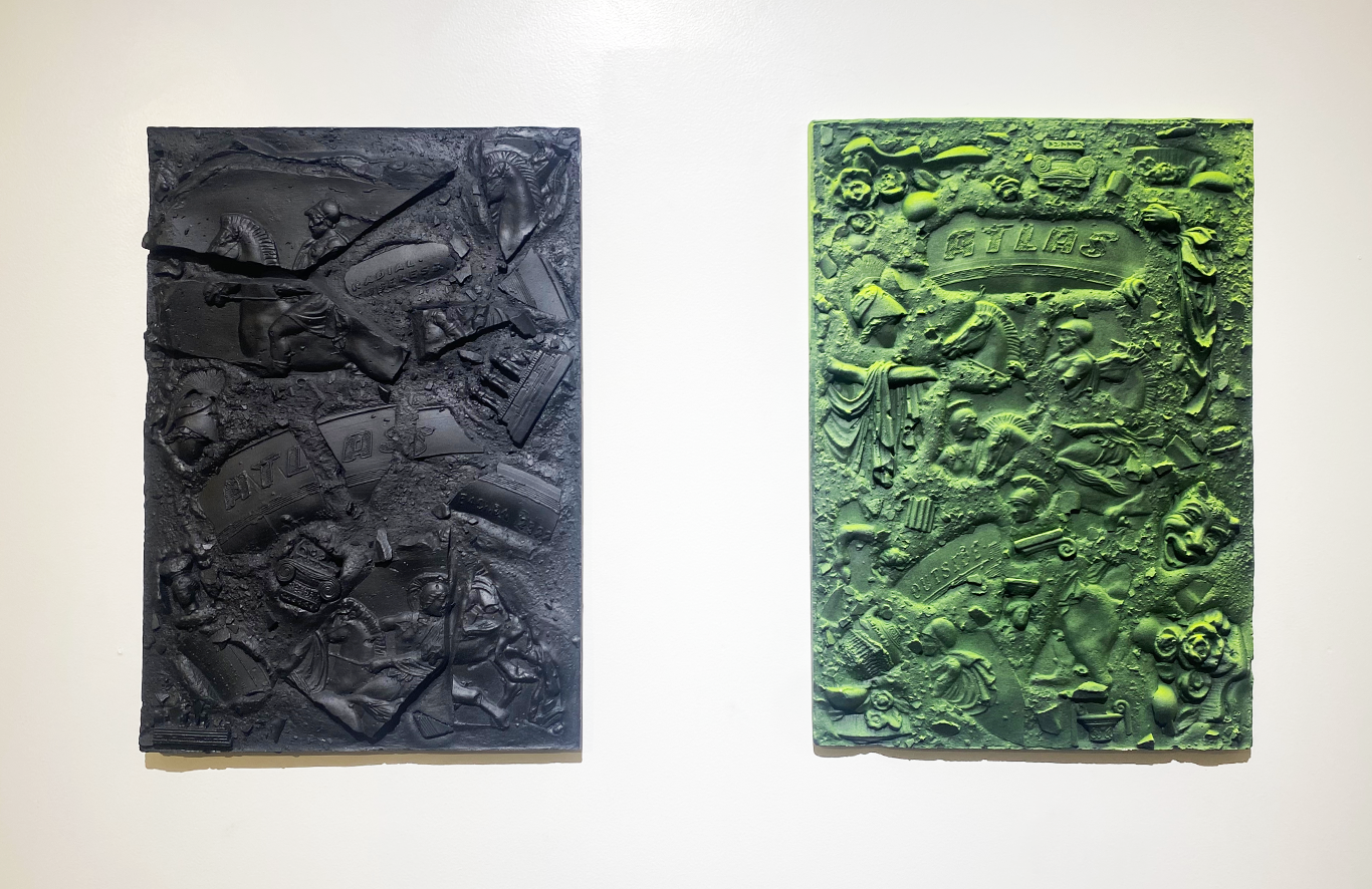 Alexandre Bavard travaille la ville comme un site de fouille : il collecte des objets urbains et les assemble en bas-reliefs où les vestiges du présent dialoguent avec l’iconographie antique. Ses toiles effacent les slogans typographiques mais laissent des spectres de rébellion à la surface (entre censure, mémoire et archivage).