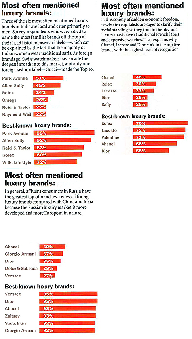 Pour la Russie, qui crée des millionnaires chaque jour, le taux annoncé est de 15%. Enfin la Chine où Armani va ouvrir 24 magasins en 2008, est actuellement le troisième consommateur de produit de luxe au monde !