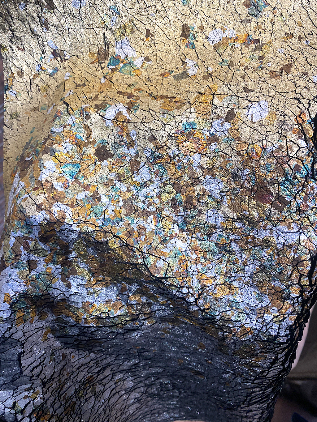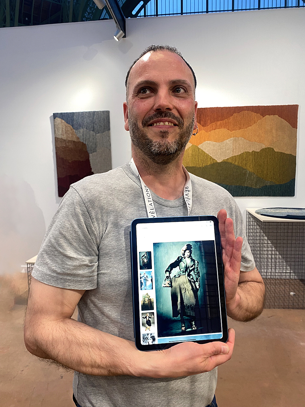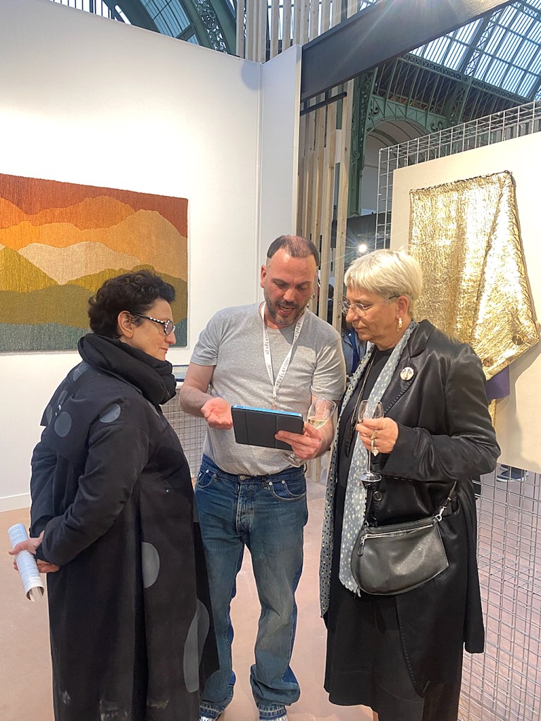 Sur leur stand, j’ai découvert le travail fascinant de Daniel Henry, ennoblisseur. Grâce au mécénat de la ville de Bruxelles, il signe Velum Magneticus, une œuvre destinée à la salle des mariages de l’Hôtel de Ville gothique. Composée d’une tenture à plis et d’une broderie par application (patchwork) sa création s’adosse à une structure datant elle de 1897. Il m’apprendra, à demi-mot, collaborer depuis plusieurs saisons avec Maison Martin Margiela sur un procédé d’application d’or sur tissu puis craquelé à la main.