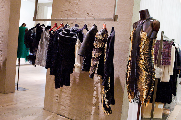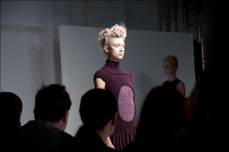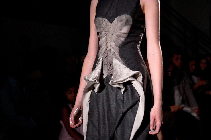 Chez Yiqing Yin, qui avait déjà fait sensation lors du Festival d’Hyères 2010, sans pour autant remporter de prix, la dimension artistique est peut-être moins revendiquée. Cependant on retrouve cette envie quasi-obsessionnelle de travail sur la matière. Bandelettes et lacets chez l’une, plissés très serrés chez l’autre, un travail de sculpture minutieuse.
