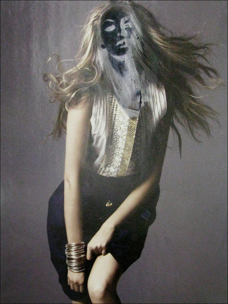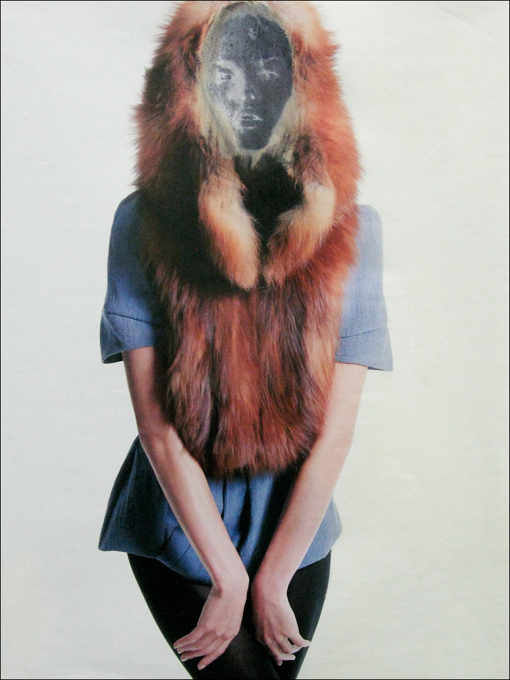 … cependant là où Martin Margiela supprime tout affect en employant un voile opaque, il reste chez Serge Fruehauf les traits du visage et le regard, provoquant autant d’attirance que le vêtement lui-même. Mais la finalité est différente, Margiela s’intéresse « principalement » au vêtement, tandis que Fruehauf s’interroge sur le sens de la diffusion d’un modèle de beauté dans les magazines de mode.